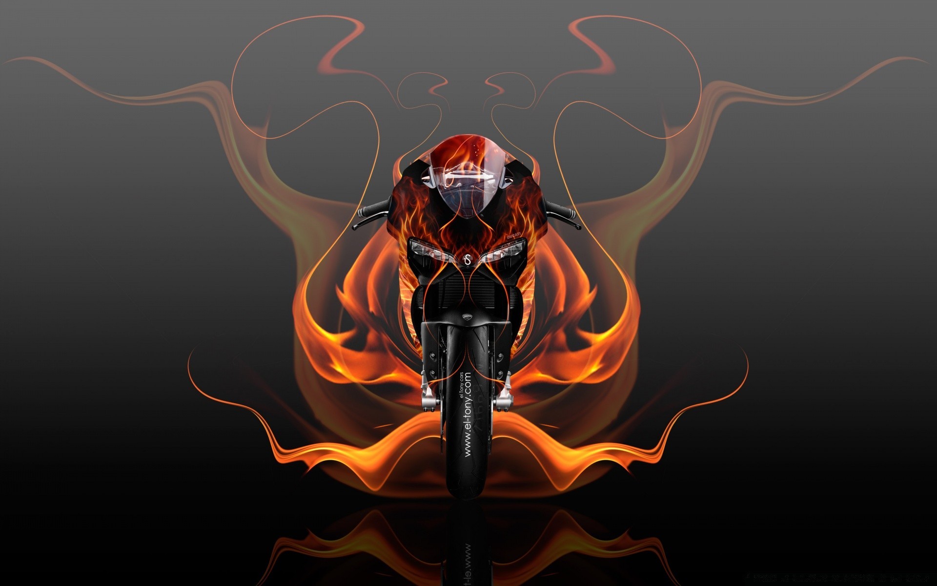 Una poderosa motocicleta con lenguas de fuego abstractas sobre un fondo gris