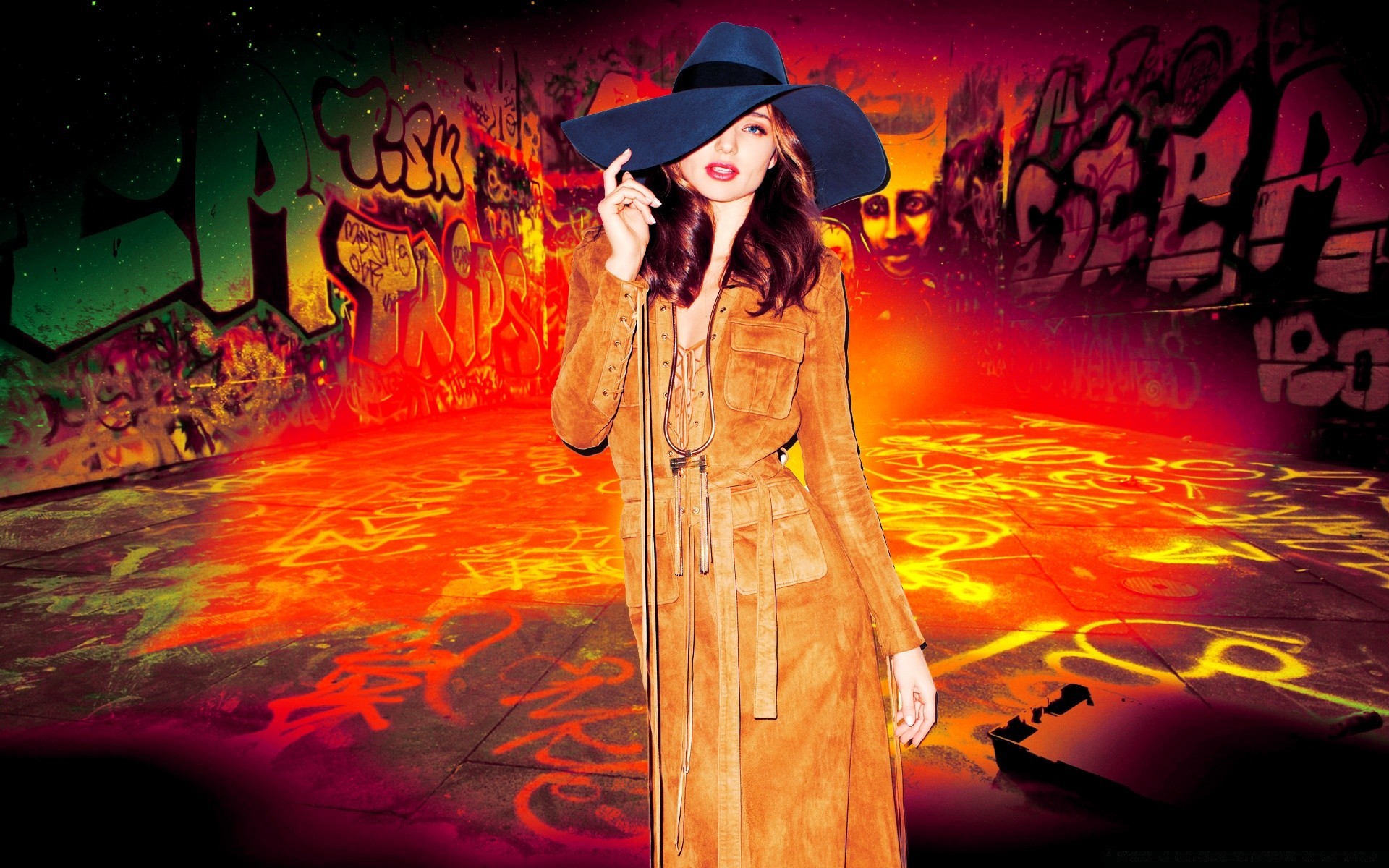 Chica con sombrero en el fondo de gráficos de fuego