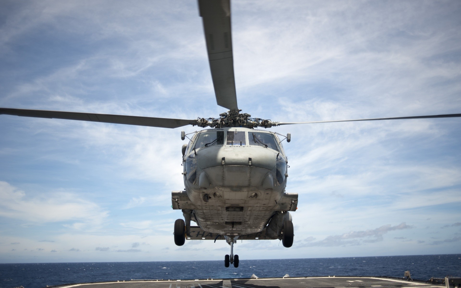 Helicóptero sobre la plataforma de despegue en el barco