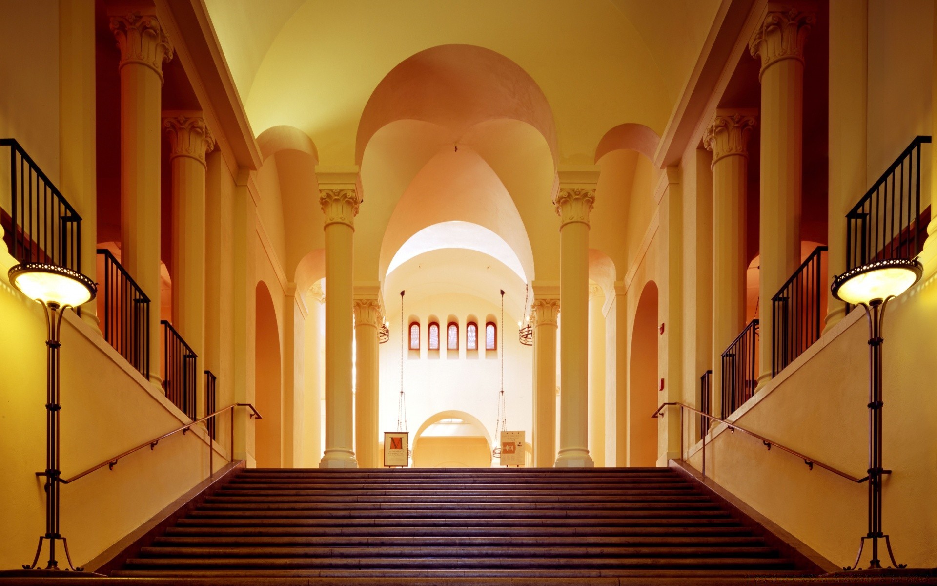 Amplia escalera dentro del edificio con una hermosa arquitectura en cálidos tonos amarillos