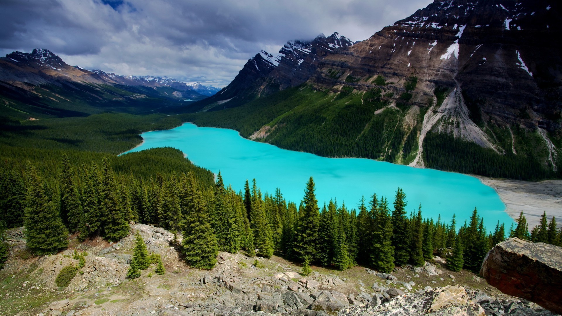 Lago azul en el fondo de las montañas