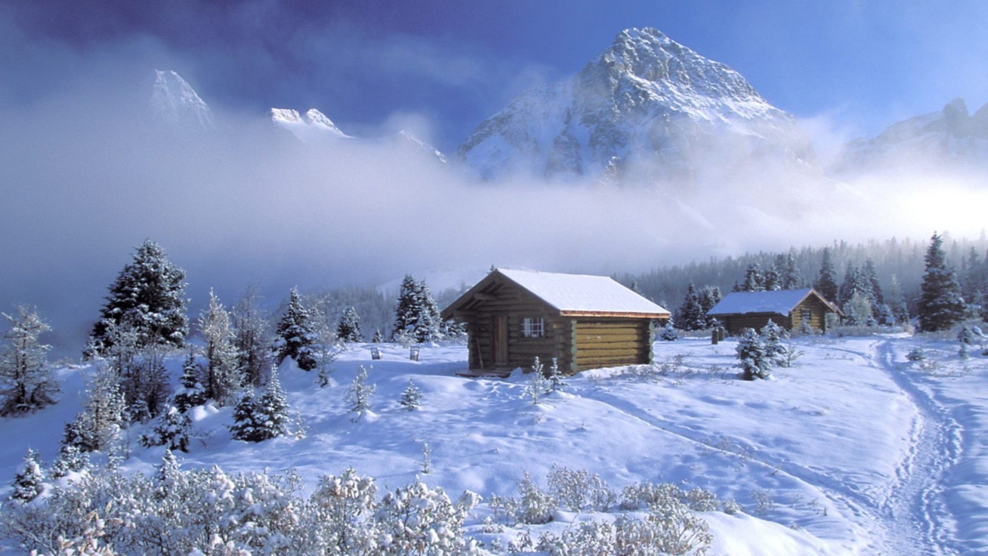 Cabaña en el bosque de invierno en el fondo de las montañas
