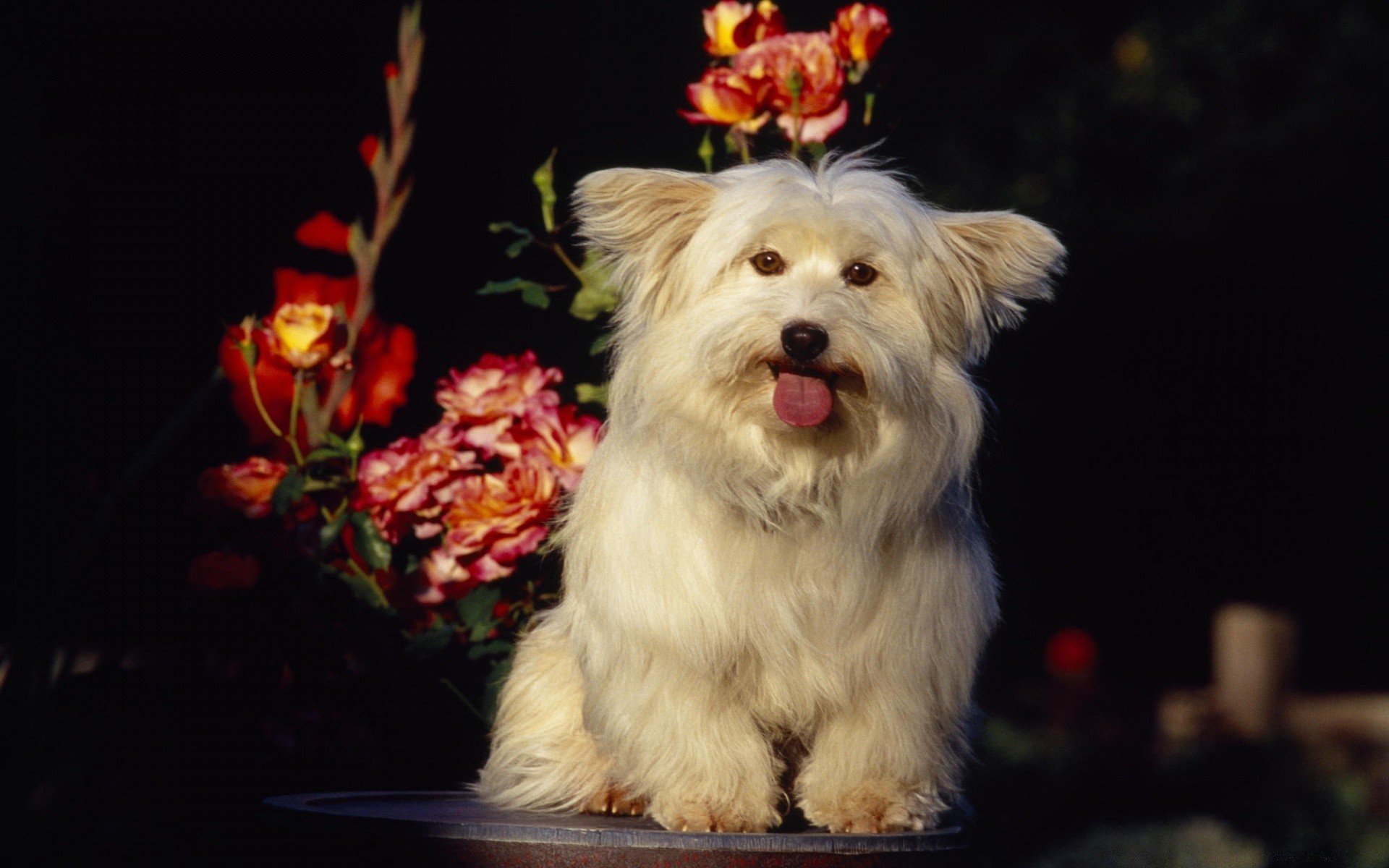 Perro blanco sentado junto a las flores