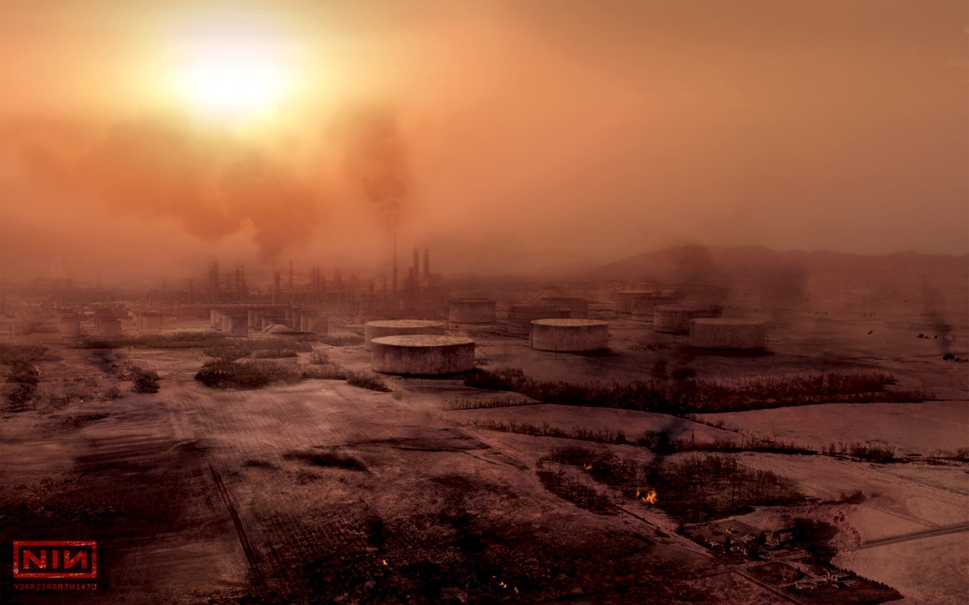 Árboles de naranja y hojas caídas en otoño al atardecer