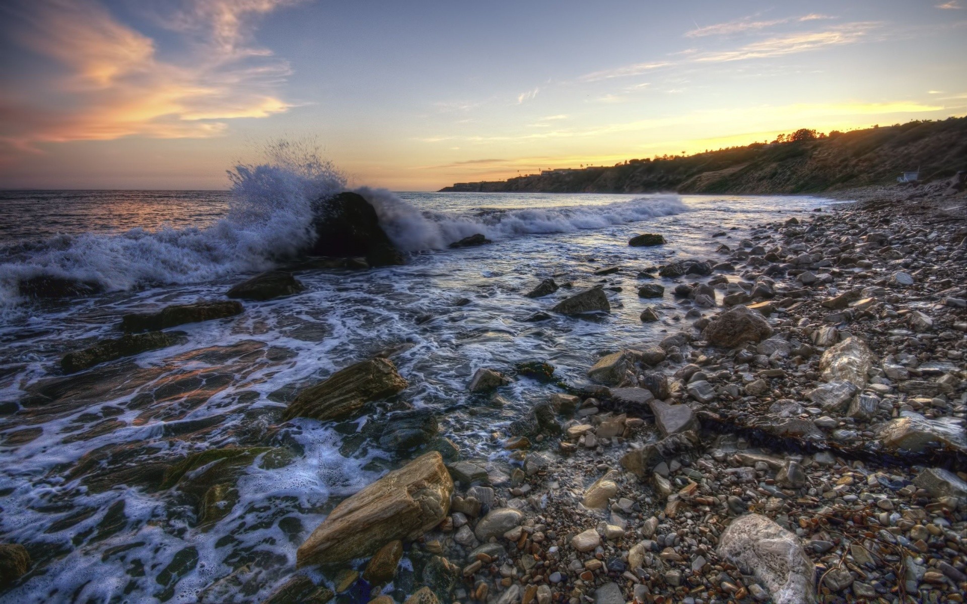 Playa de guijarros en el mar al atardecer