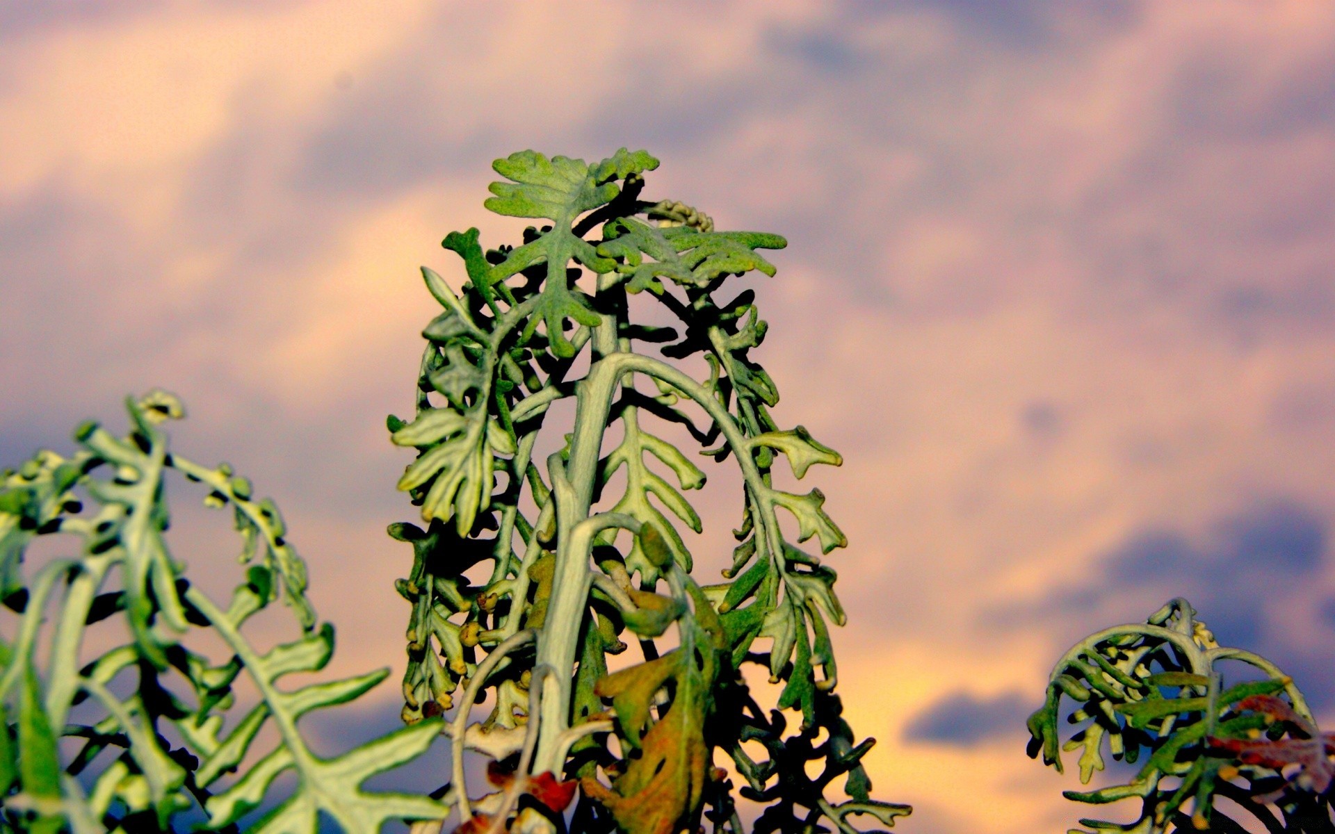 Hojas de plantas verdes contra un cielo azul y amarillo al atardecer