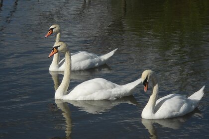 Tres cisnes blancos nadando en el lago