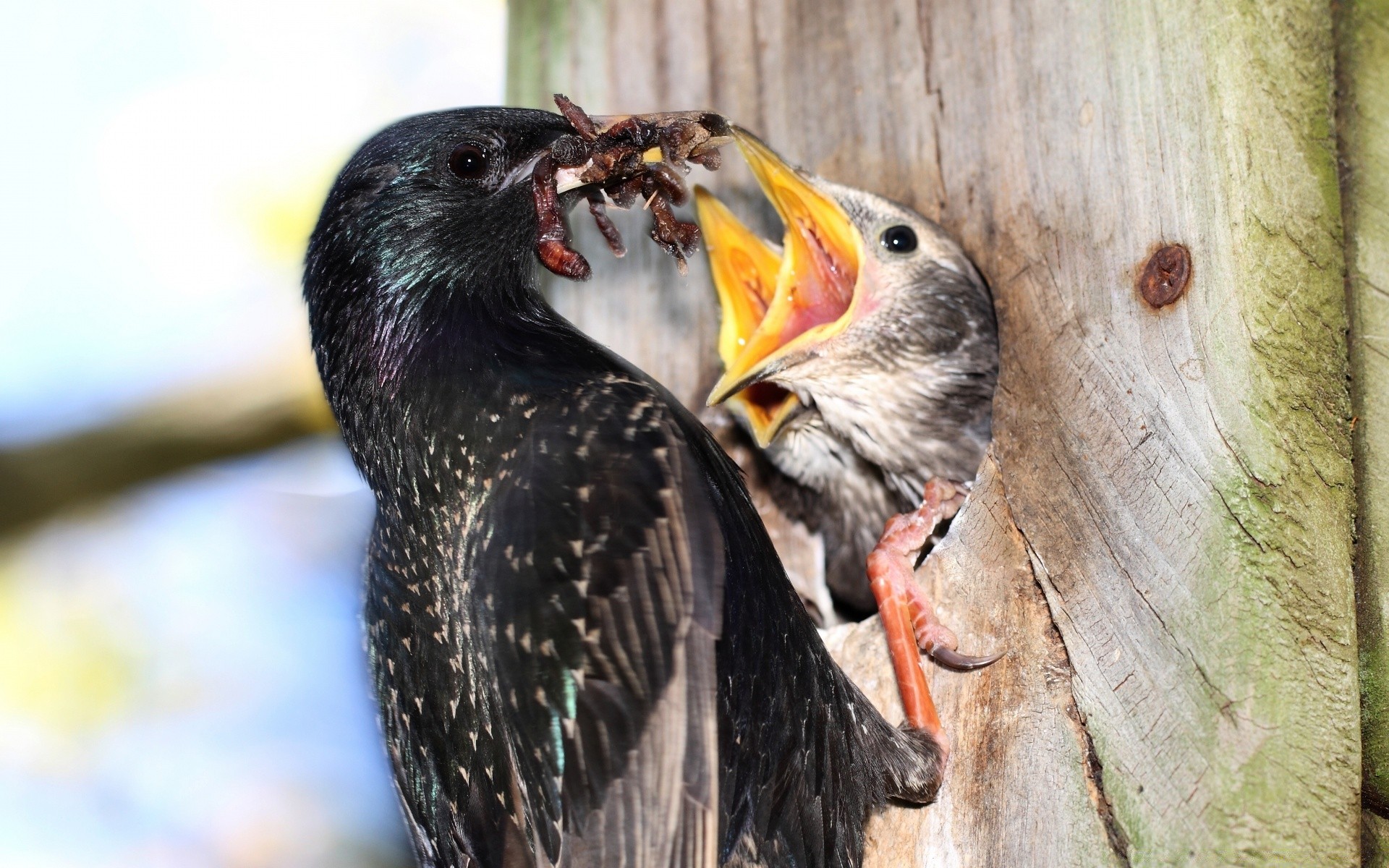 Las aves se sientan en la rama de un árbol cubierto de musgo