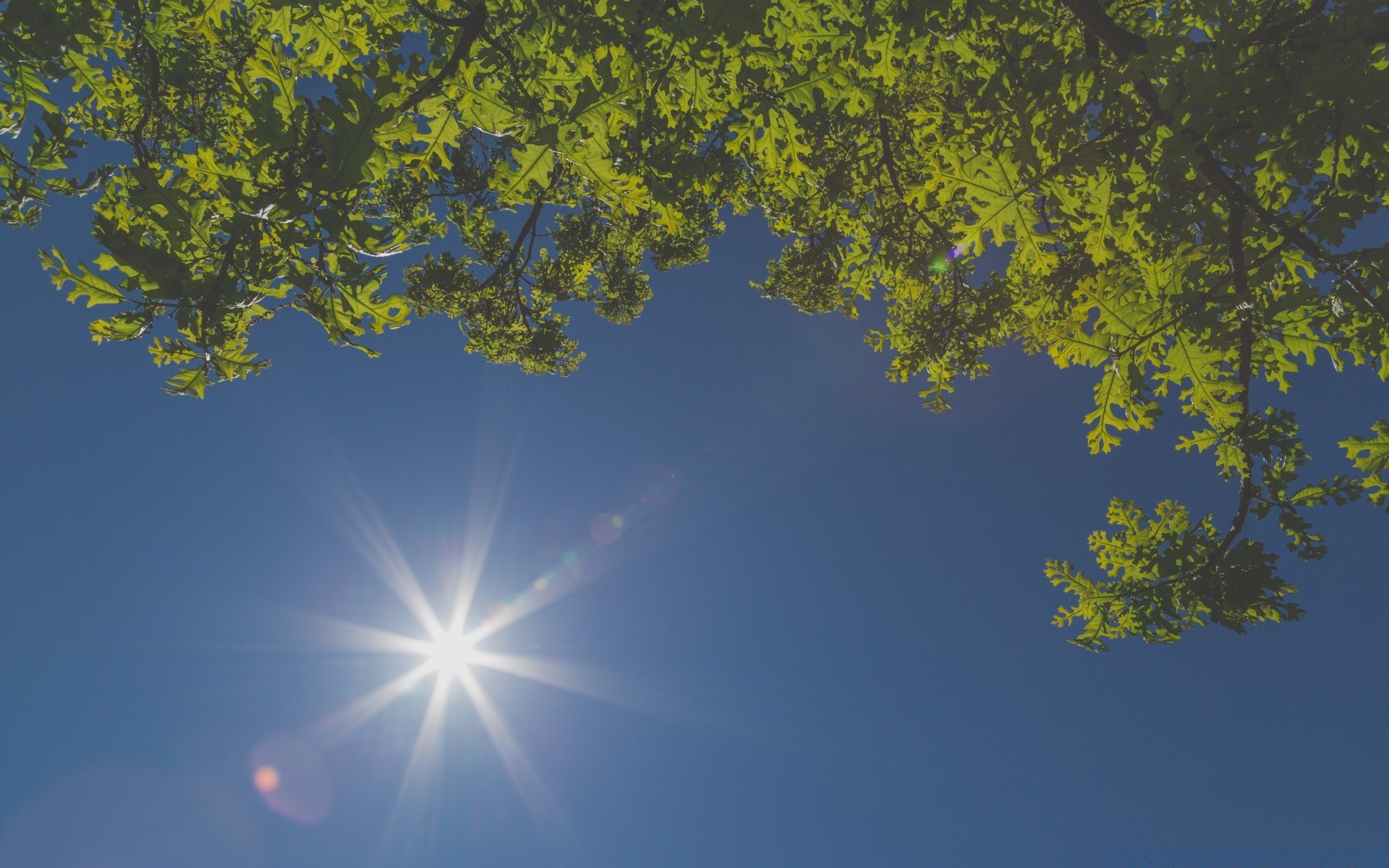 Árboles verdes brillantes contra los picos de las montañas y el cielo azul