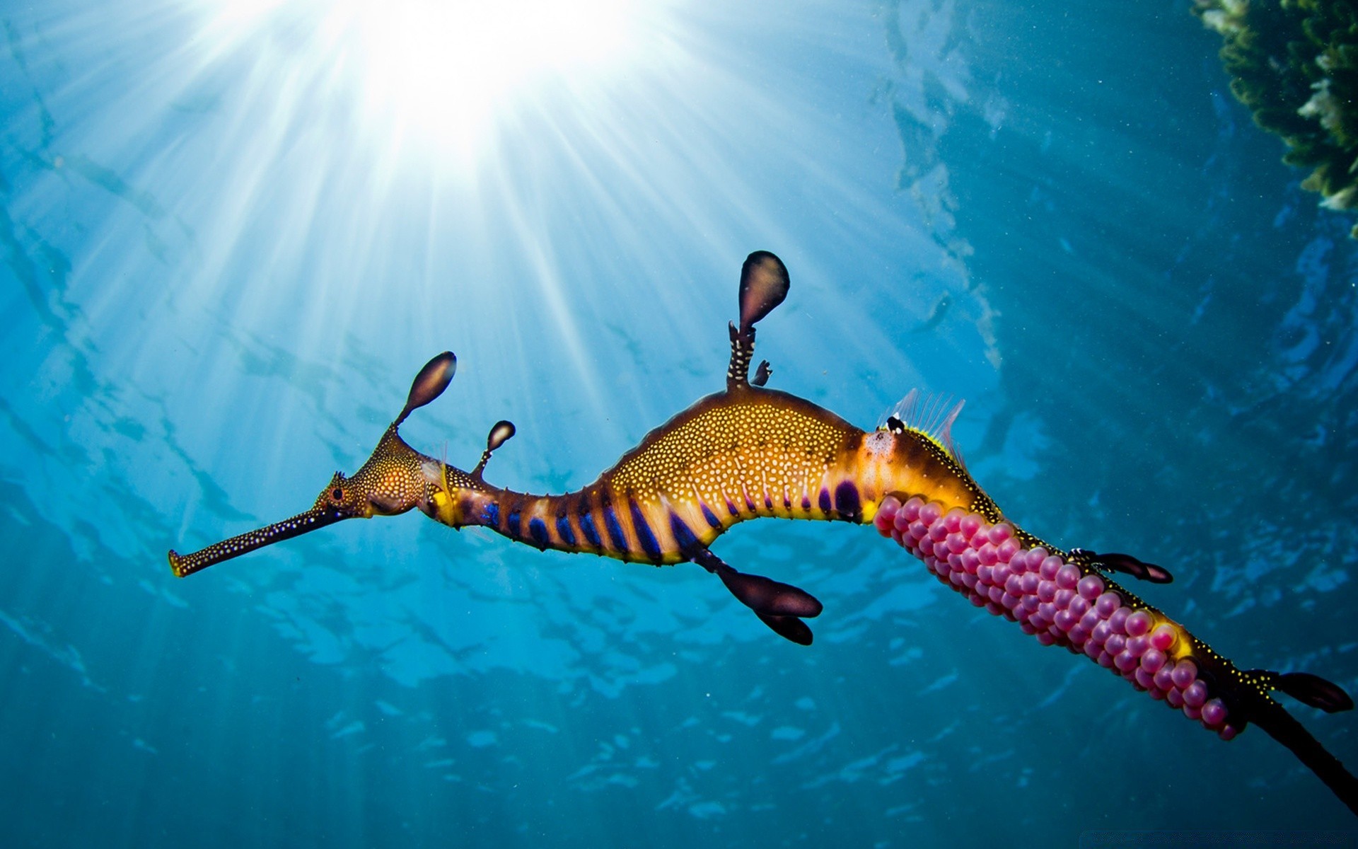 En el agua, muchas hojas de nenúfares y peces nadan cerca