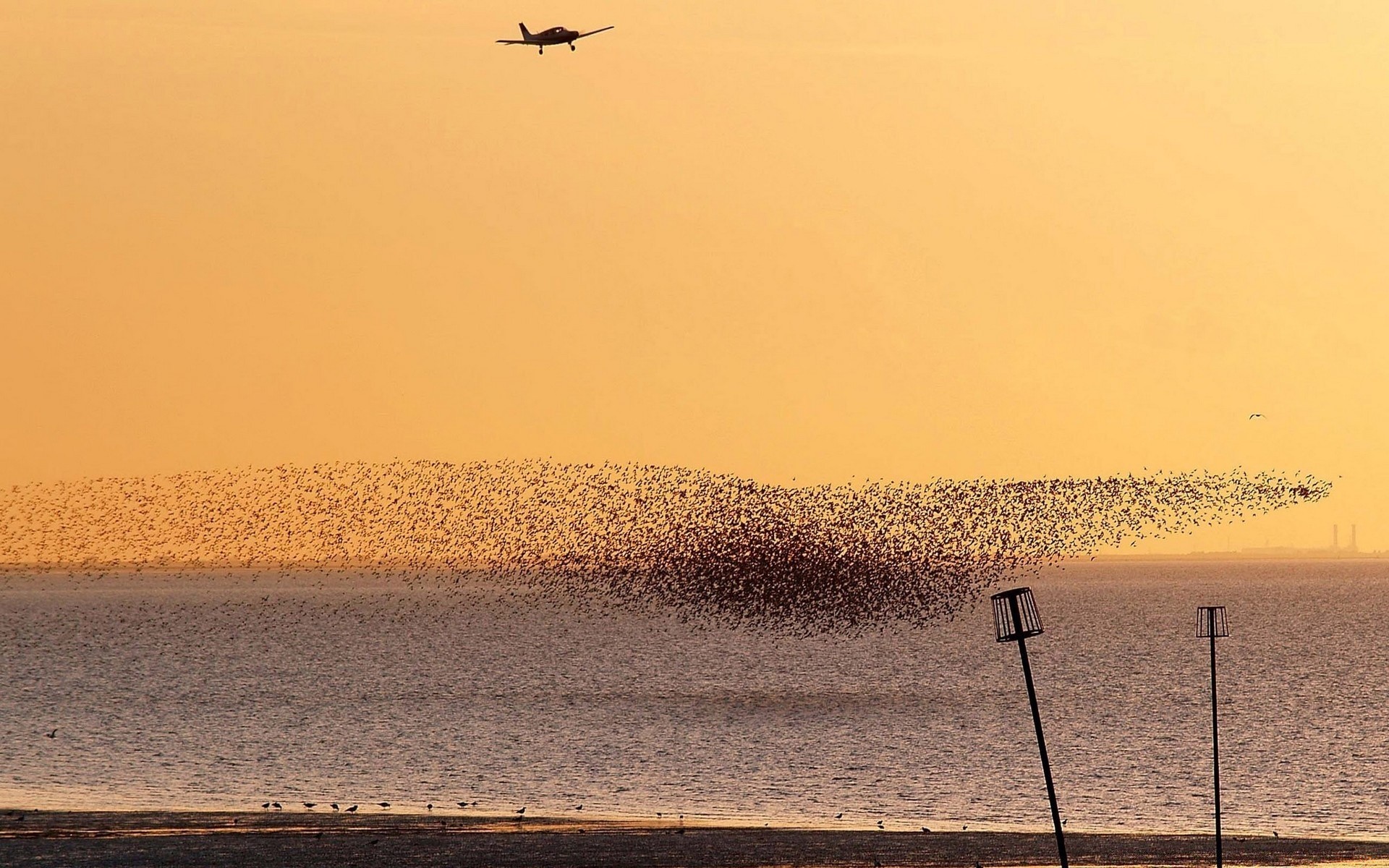 Un avión vuela sobre una playa y una bandada de pájaros