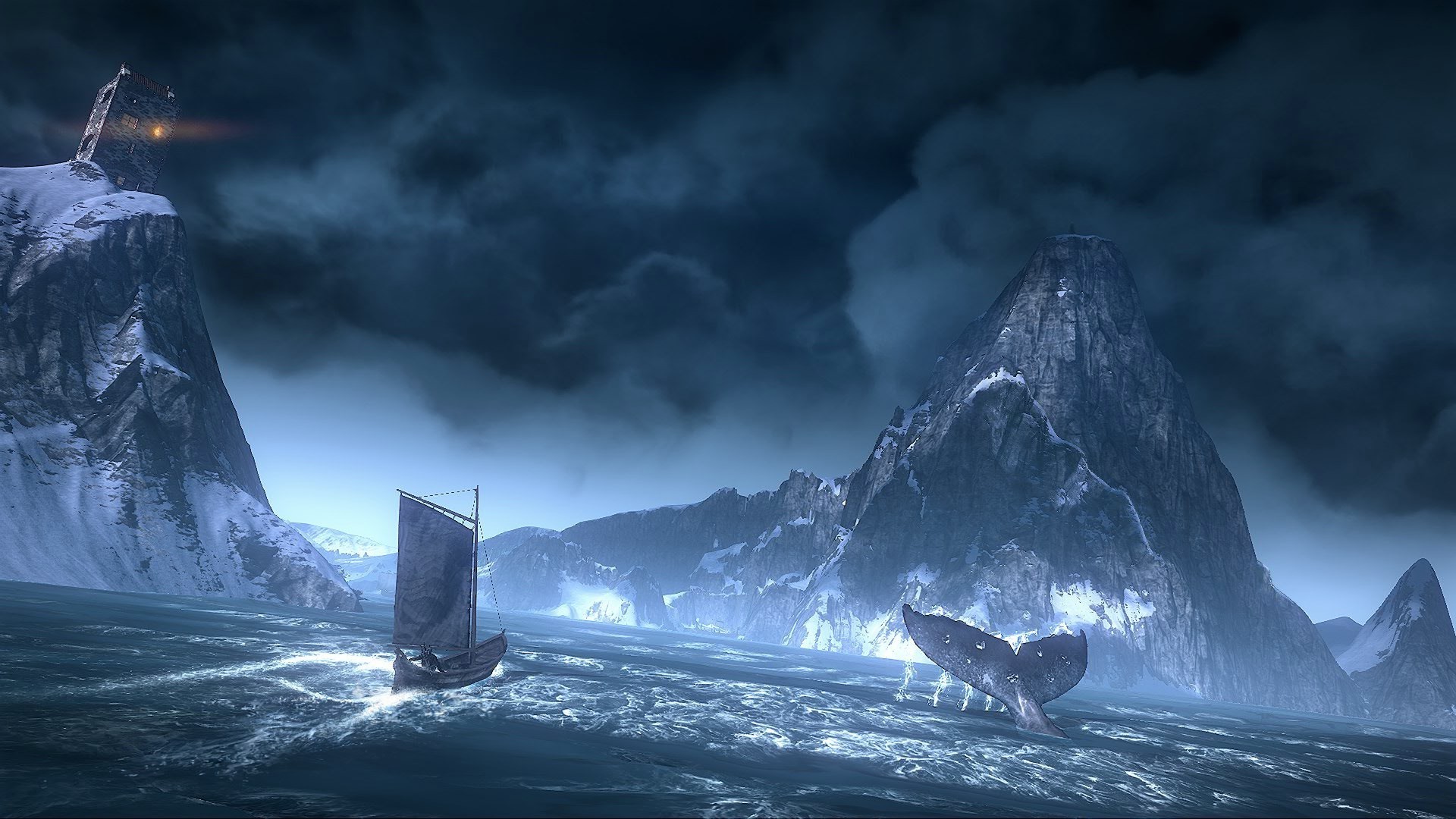 Paisaje agua mar y colas de peces