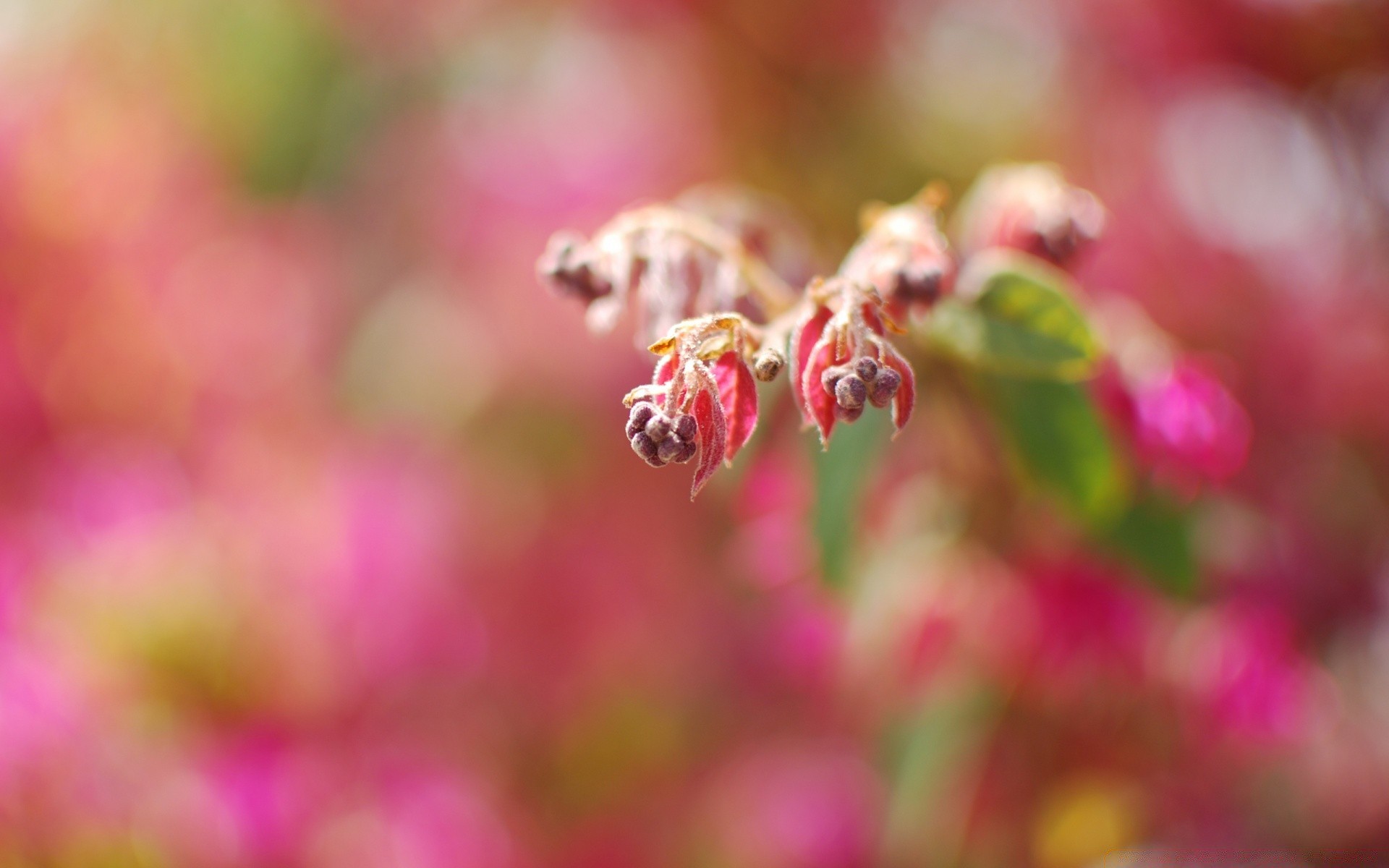 Ramitas con pétalos rojos y bayas sobre un fondo rosa borrosoRamitas con pétalos rojos y bayas sobre un fondo rosa borroso