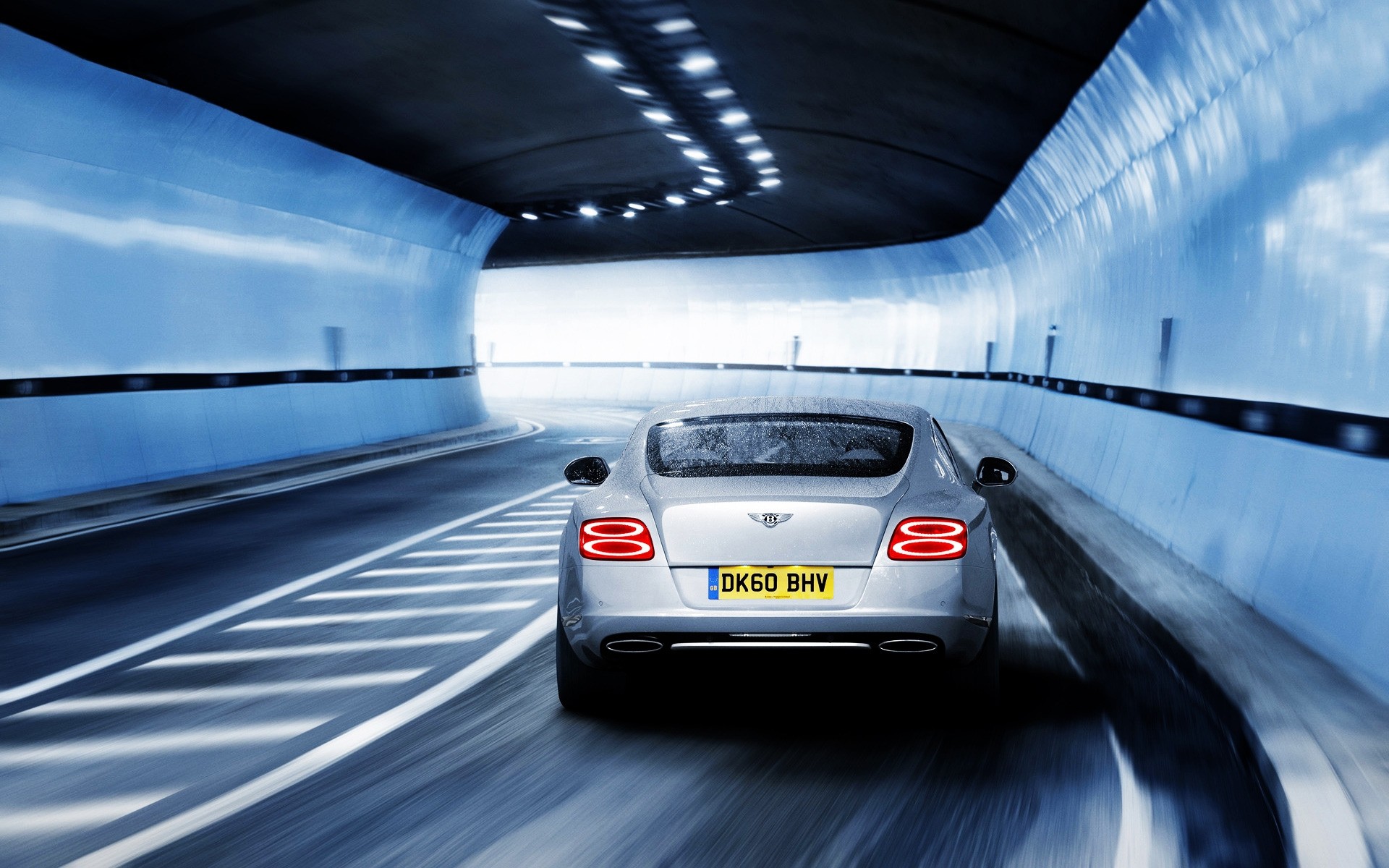 Un Bentley rojo cabalga sobre un aswalt iluminado y borroso