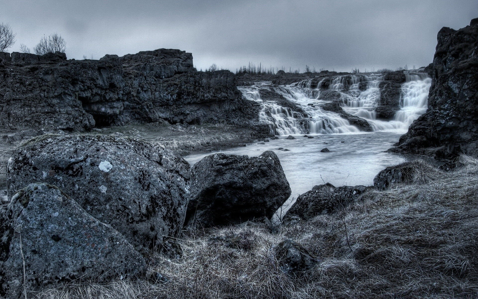 Paisaje en blanco y negro de una pequeña cascada en la orilla rocosa del río