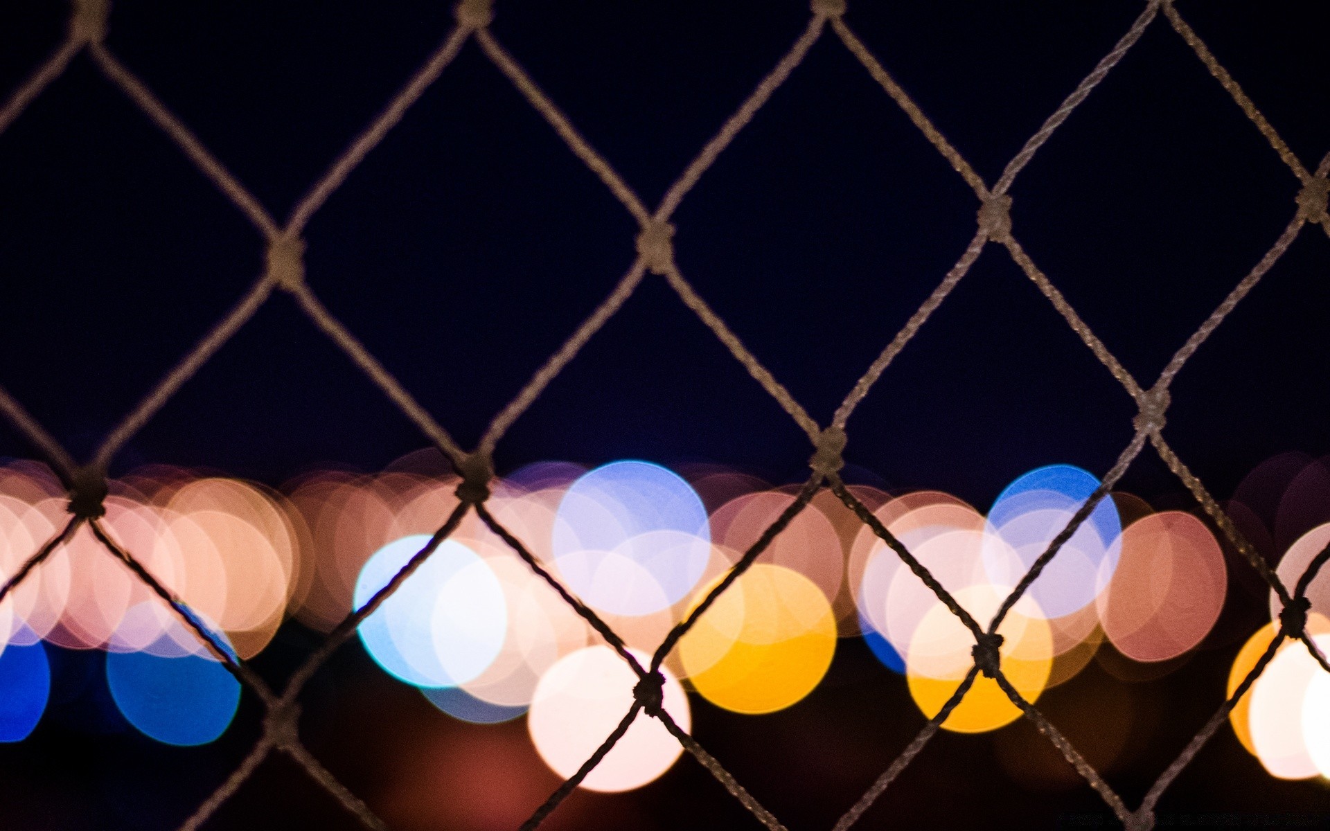 Detrás de la malla de la cerca sobre un fondo negro luces multicolores