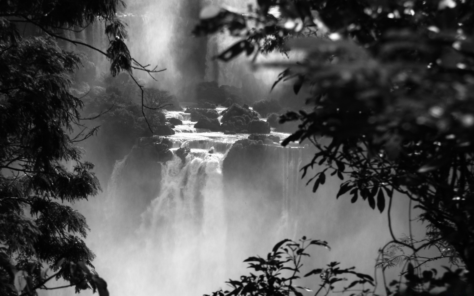 Vista de un arroyo de montaña a través de ramas negrasVista de un arroyo de montaña a través de ramas negras