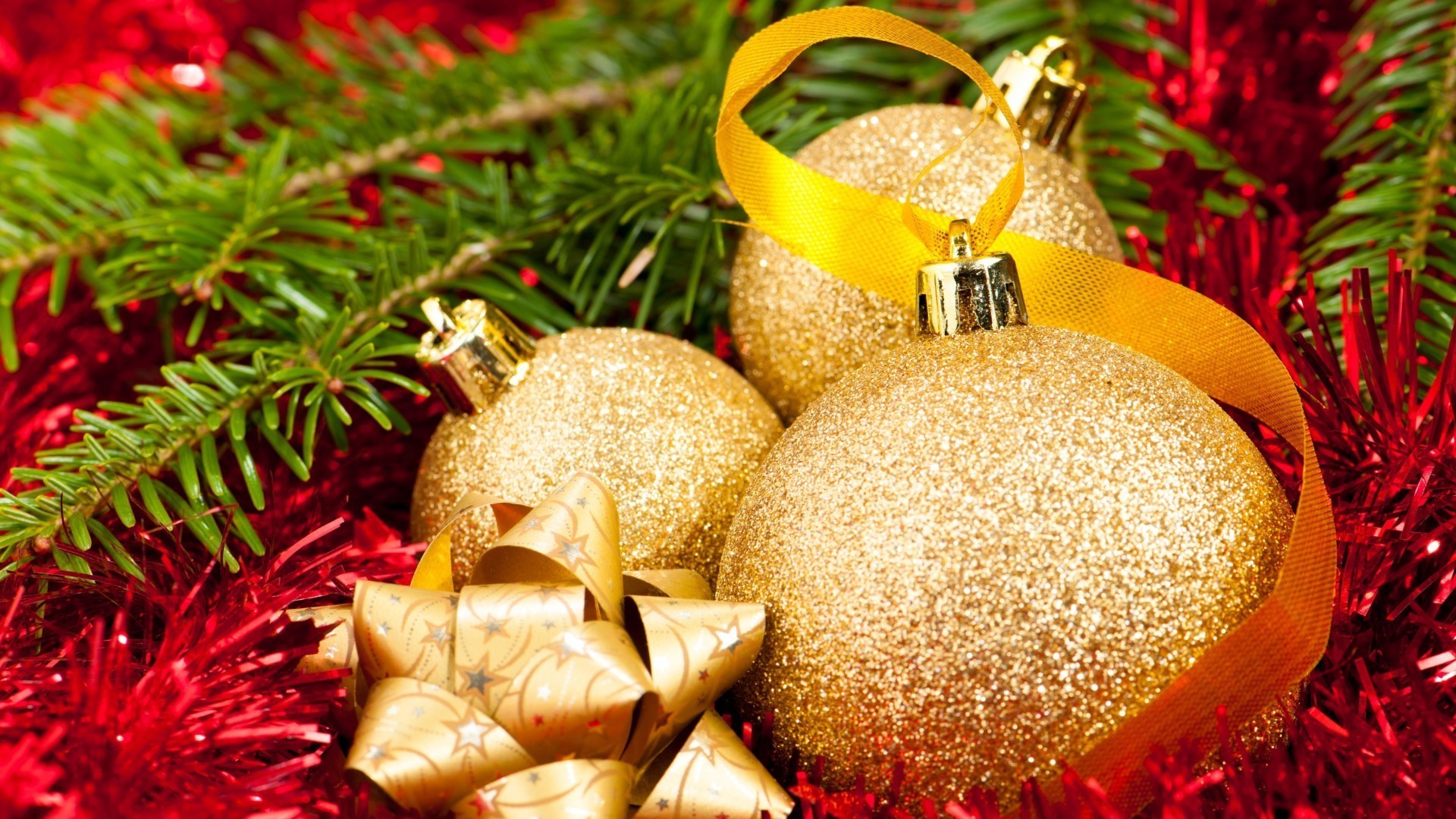 Bolas de Navidad en una canasta contra el fondo de ramas de abeto