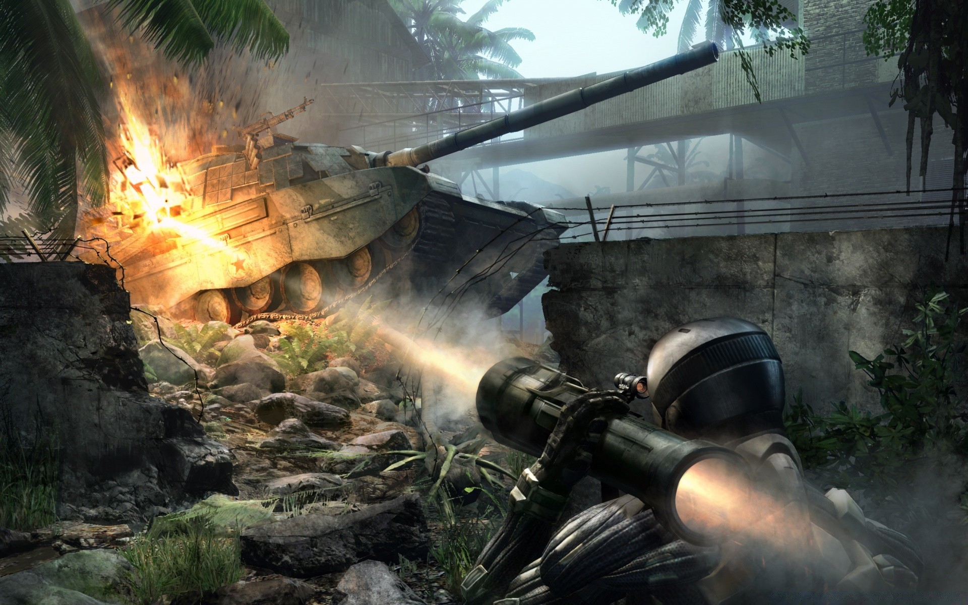 Hombre armado en ciudad humeante