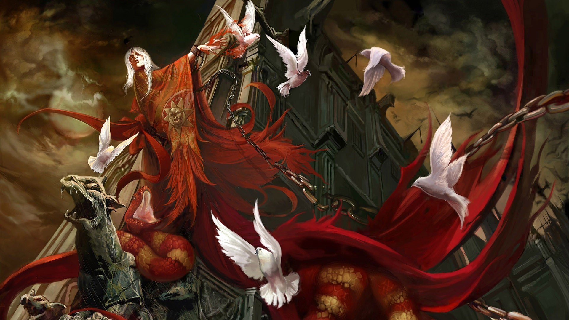 Encadenado por un brujo toda la bruja en rojo sonrió y las palomas blancas dio sus órdenes