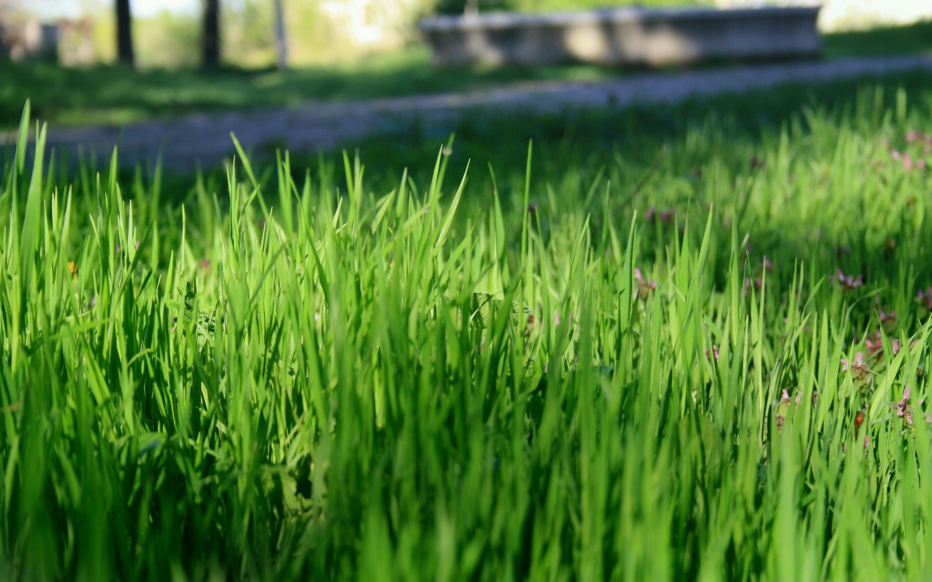 Hermoso césped de verano con un arco iris en el fondo de las casas