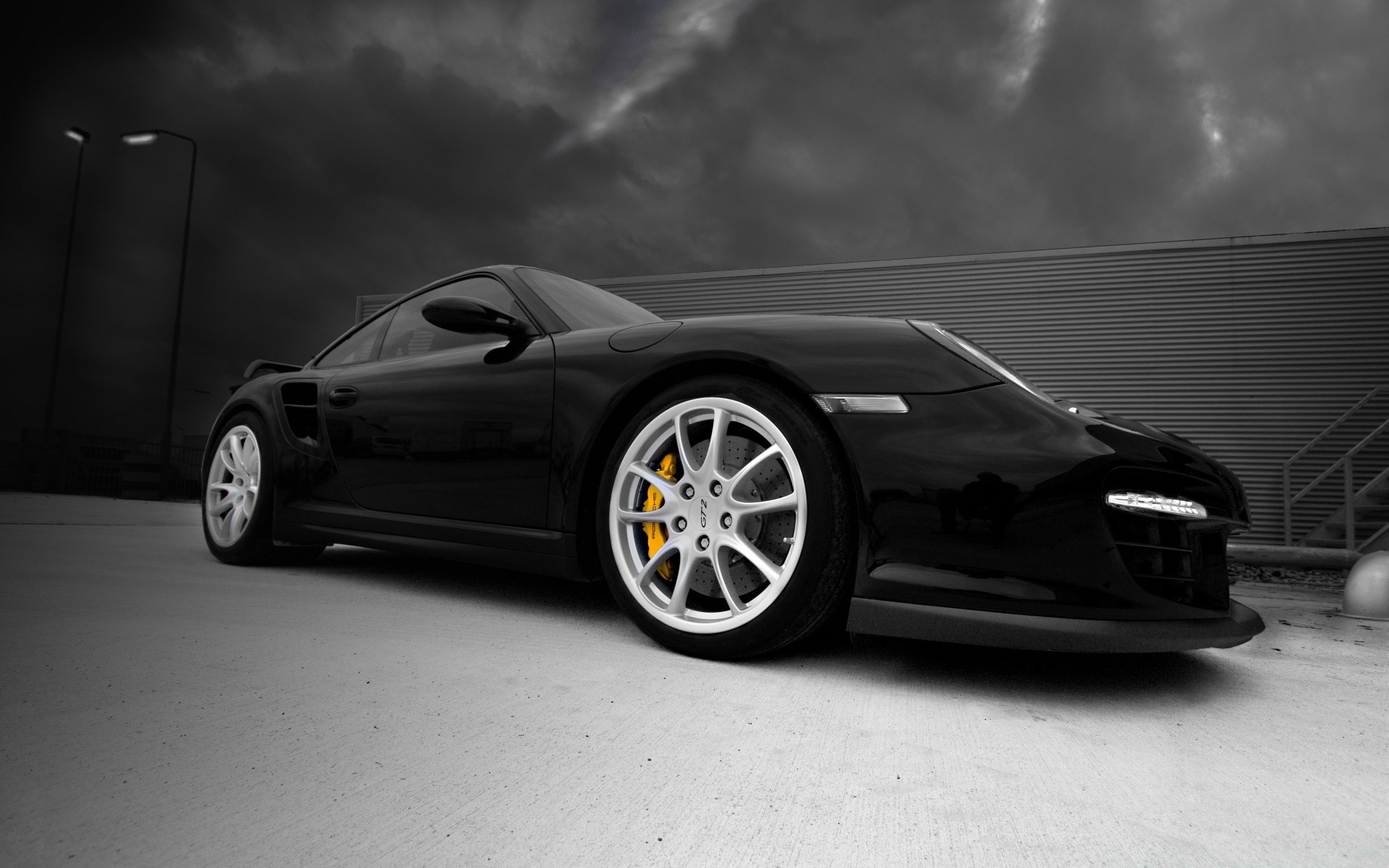 Coche de carreras negro con hermosas llantas en el fondo de la tormentaCoche de carreras negro con hermosas Llantas en el fondo de la tormenta