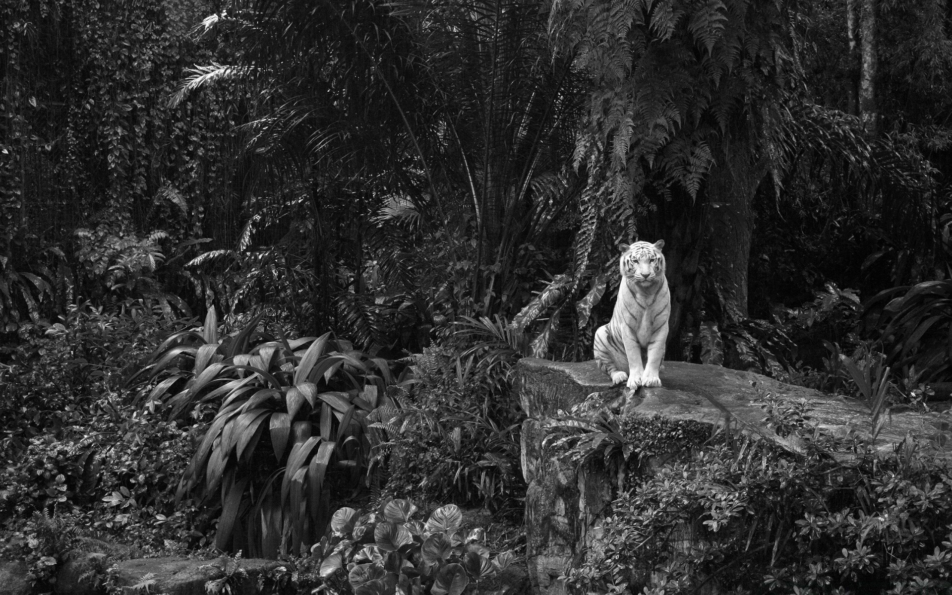 Un tigre sentado en una piedra. imagen en blanco y negro