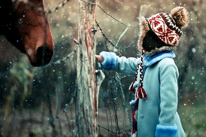 Niña alimenta a un hermoso caballo