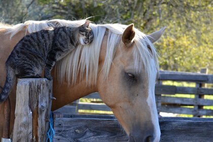 Gato europeo frota la melena de un caballo