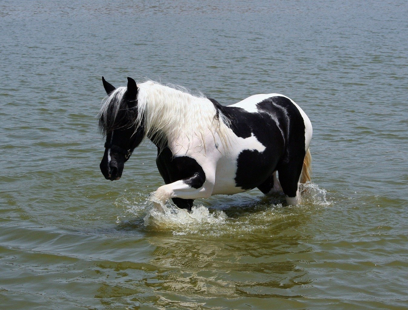 Hermosa vista de un caballo corriendo por la orilla del mar