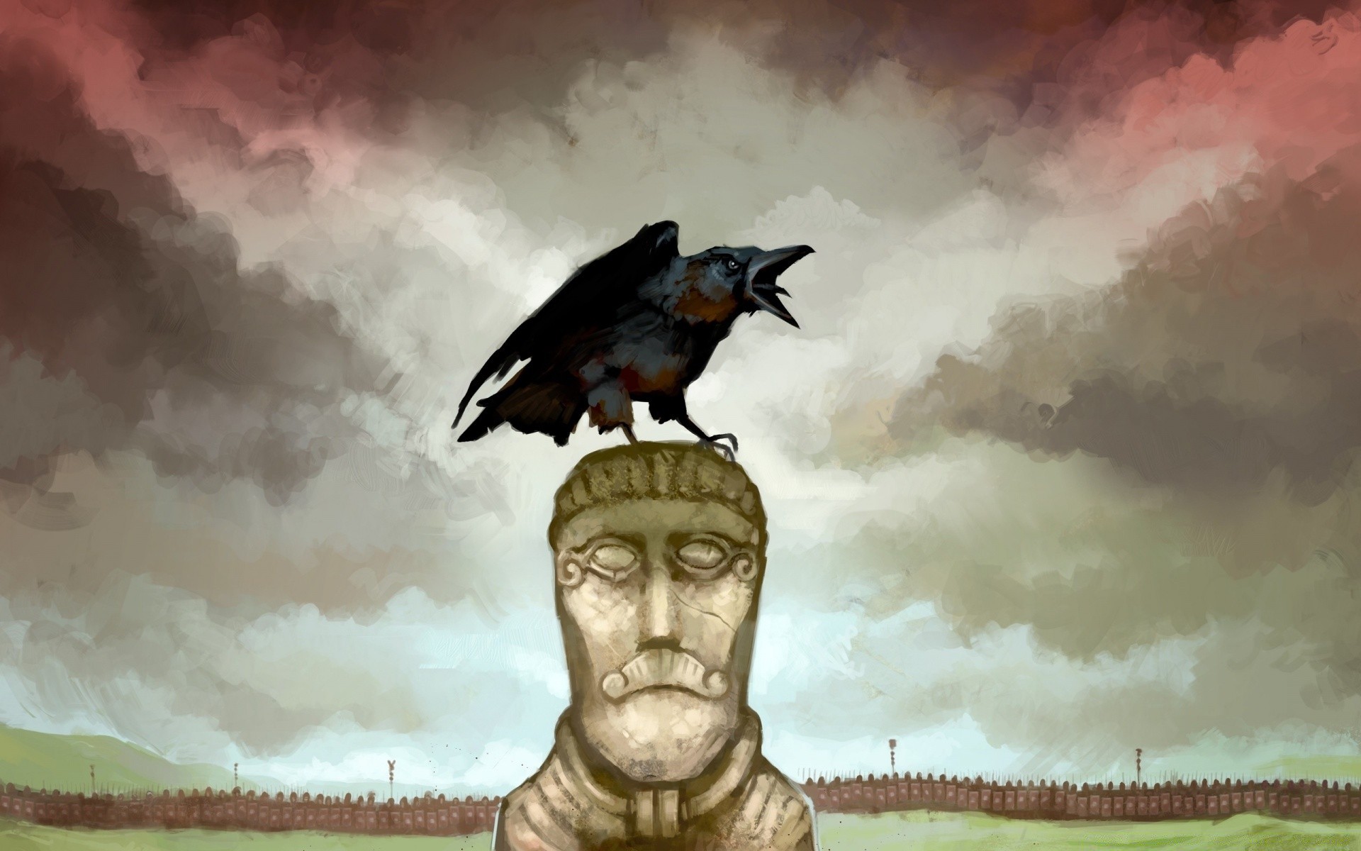 Imagen con un cuervo sentado en la cabeza de un ídoloImagen con un Cuervo sentado en la cabeza de un ídolo