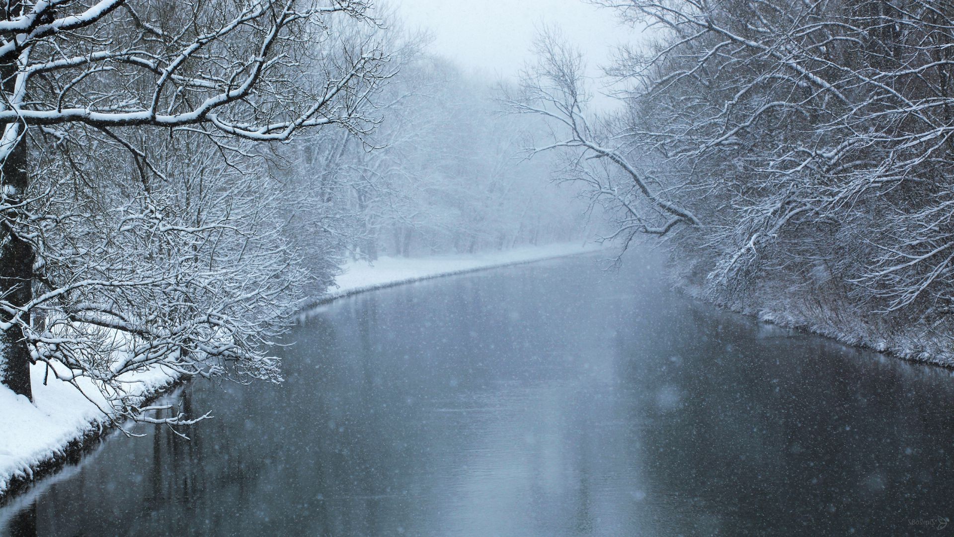 El asfalto negro se adentra en el horizonte del bosque cubierto de nieve