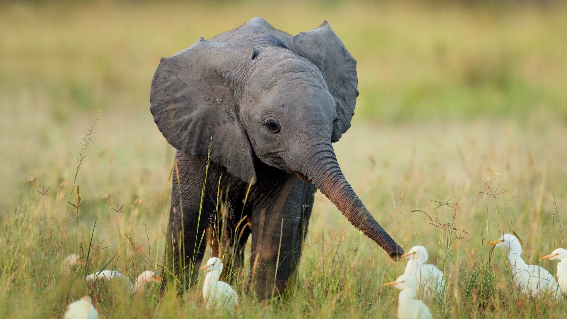 Elefante en la Sabana juega con aves