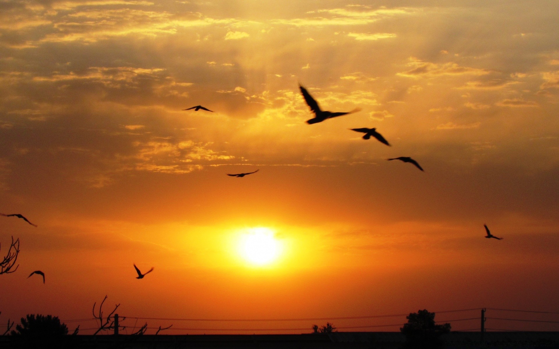 Paisaje natural con bandadas de aves en el fondo de la puesta de sol