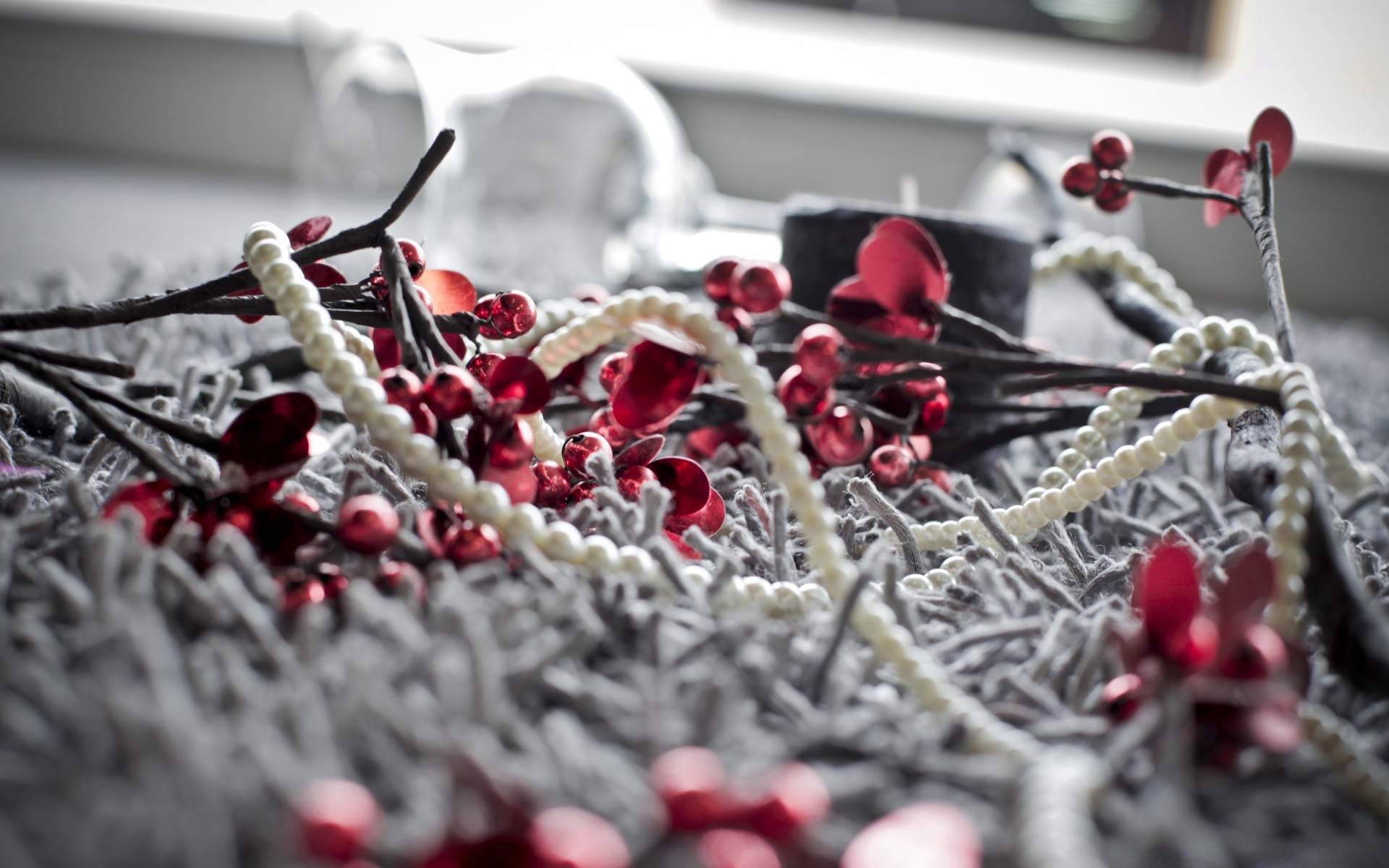 Cuentas en el alféizar de la ventana de color rojo y blanco en macro