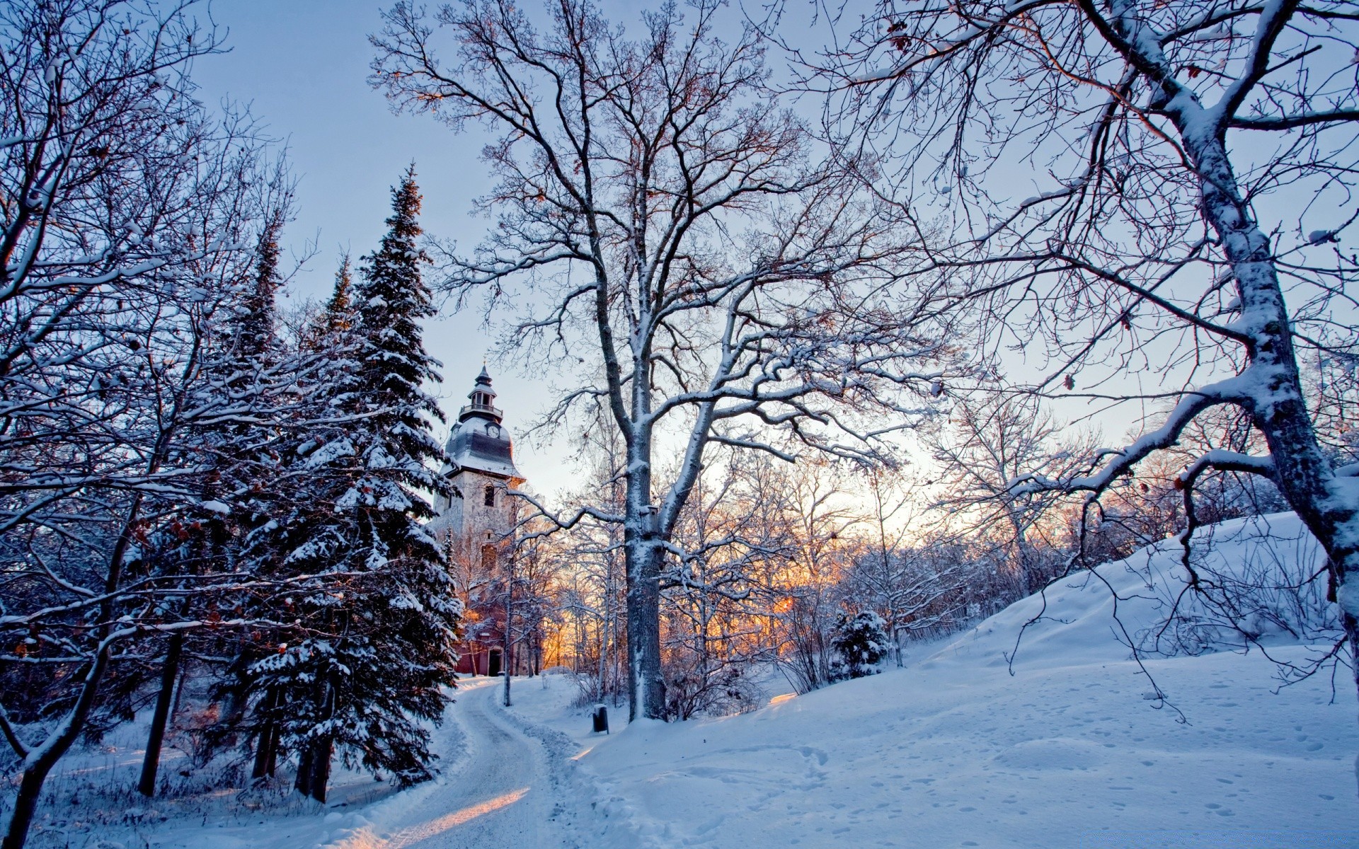 Sendero cubierto de nieve al antiguo castillo