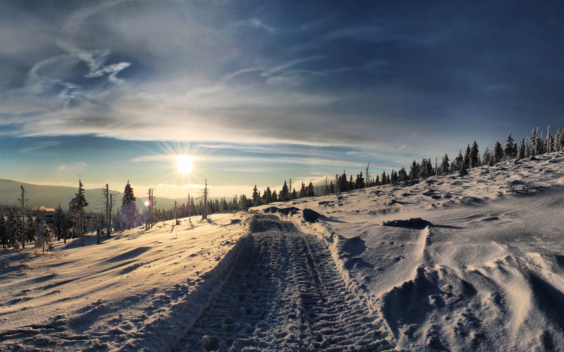 Vista desde la cima del bosque cubierto de nieve brumoso