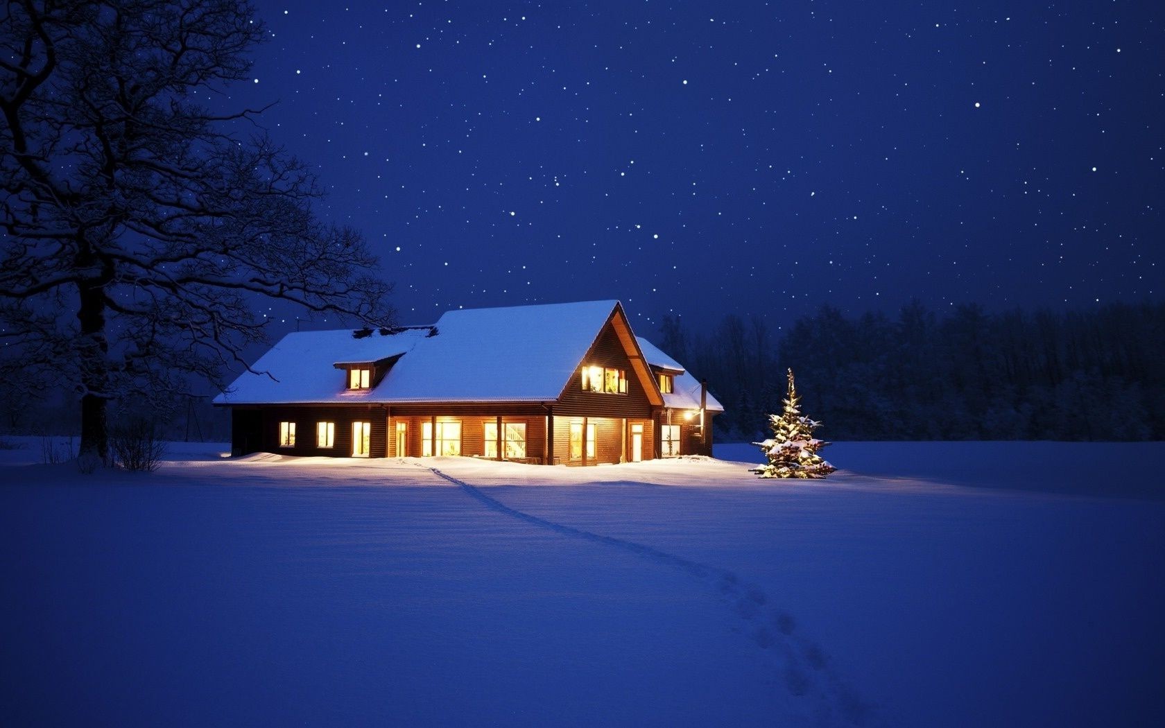 Casa en la noche en la nieve con un árbol de Navidad