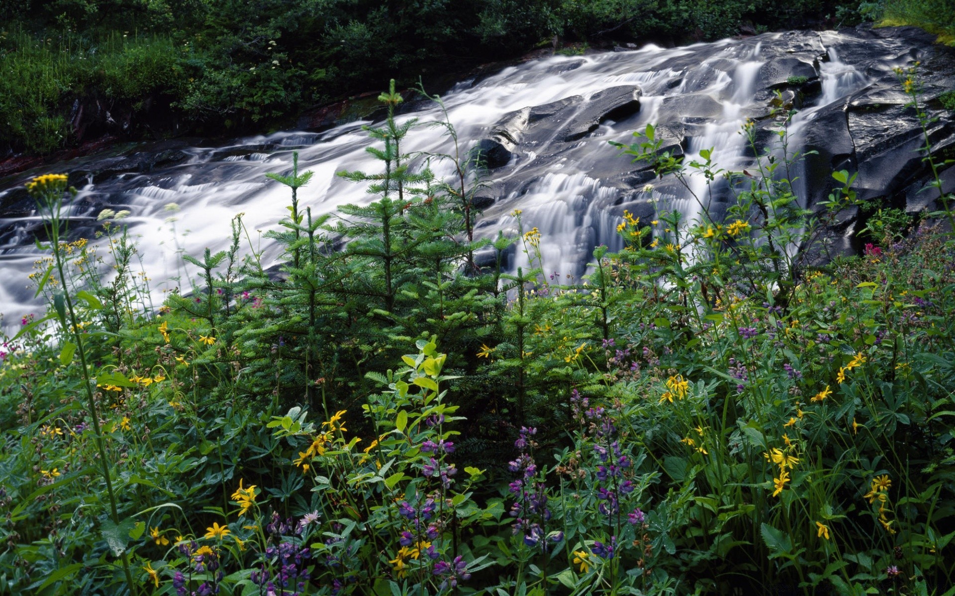 Cascada de verano cerca de las plantas