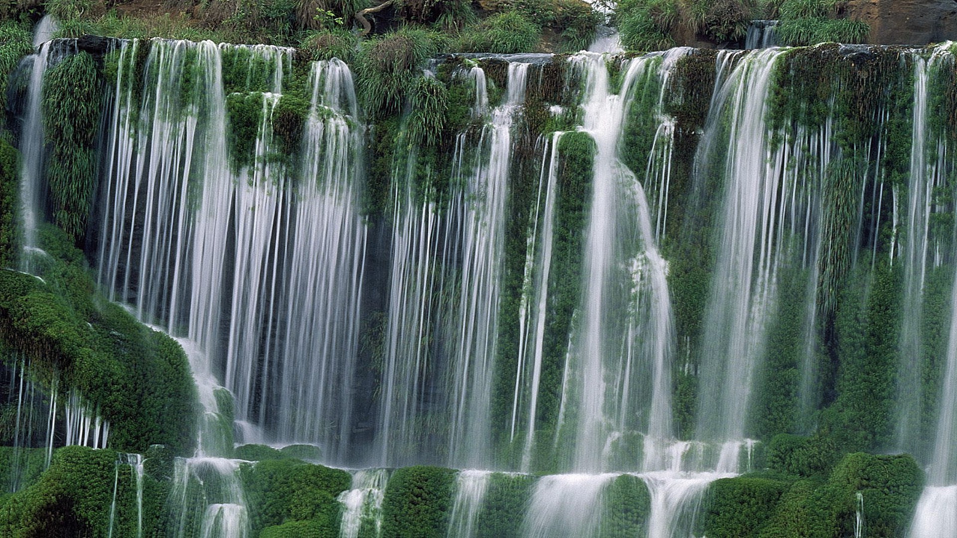 Alrededor de las cascadas musgo y árboles