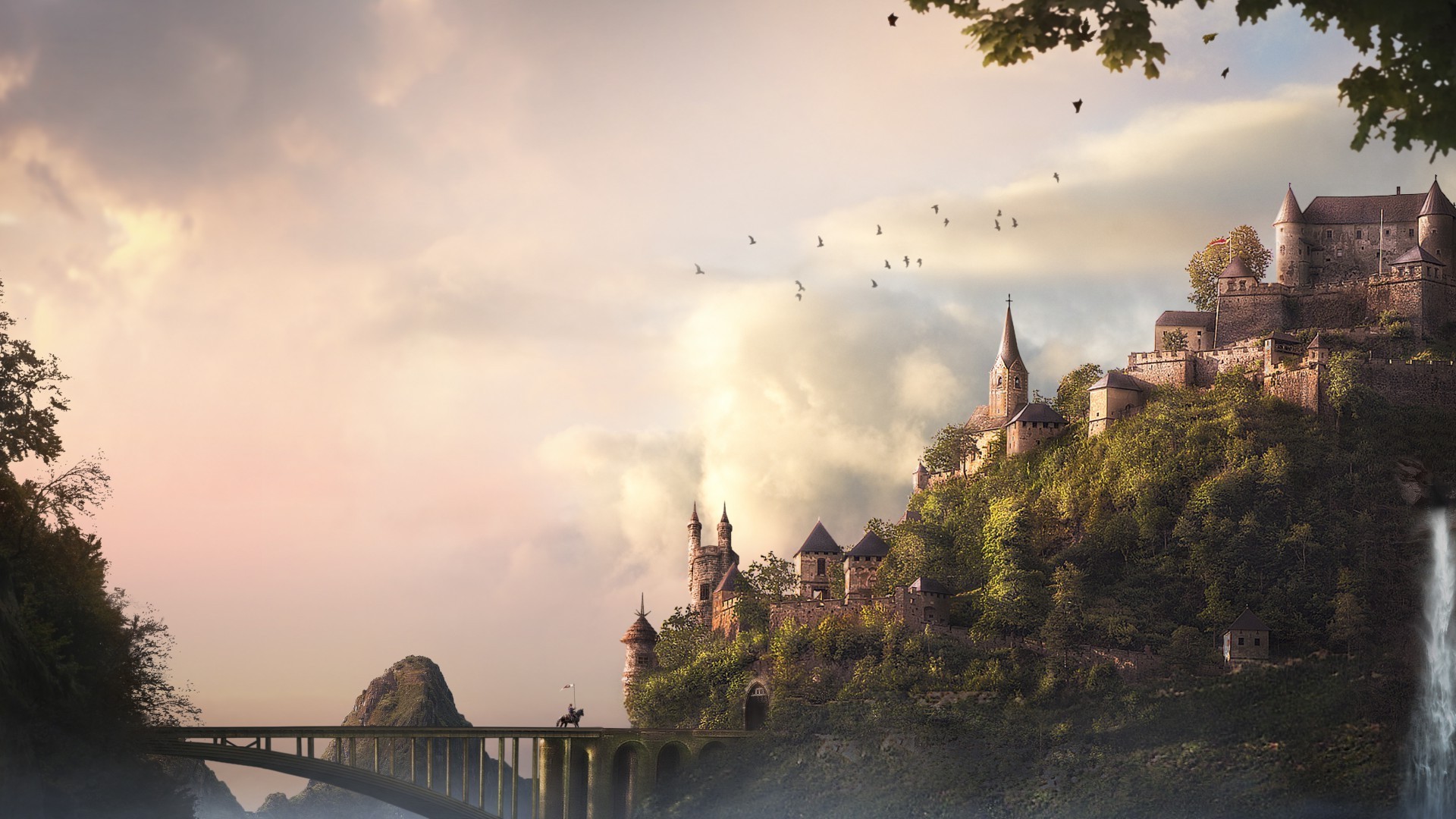 Detrás de los arbustos verdes contra el cielo castillo gris