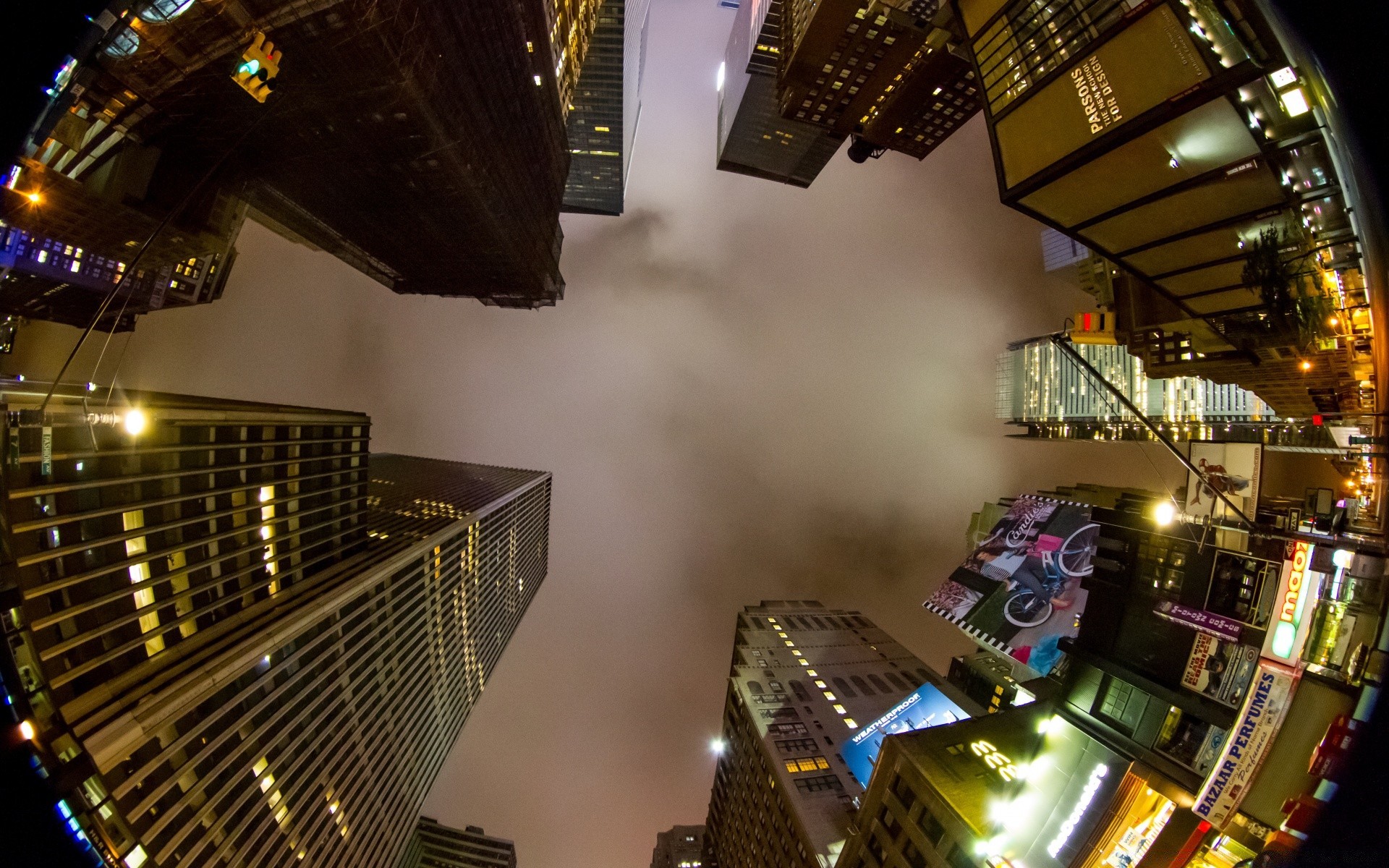 En el centro, el cielo nocturno en la niebla bordeado por rascacielos en luces