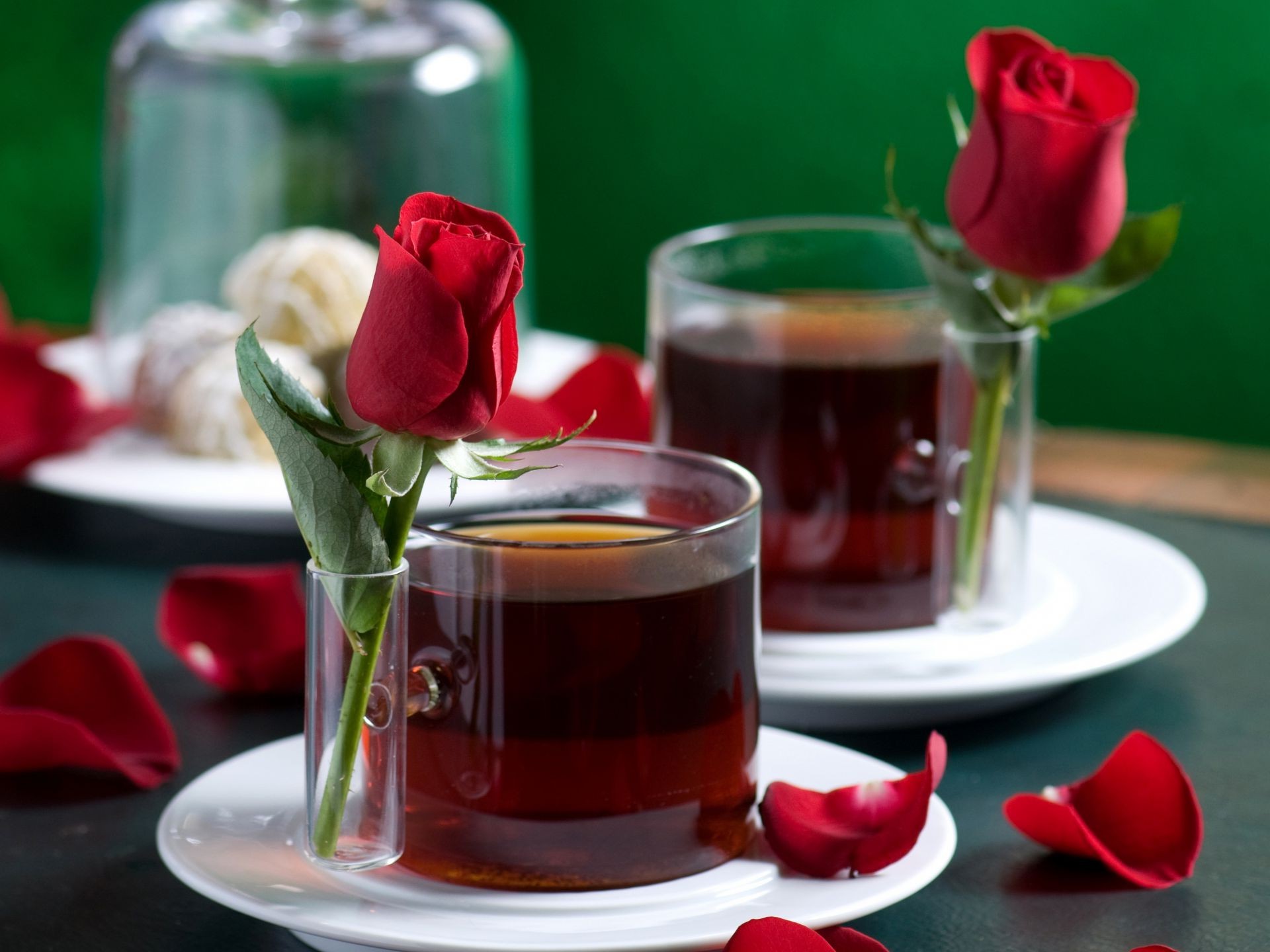 Dos cerezas maduras en una ramita con una hoja verde sobre un fondo turquesa