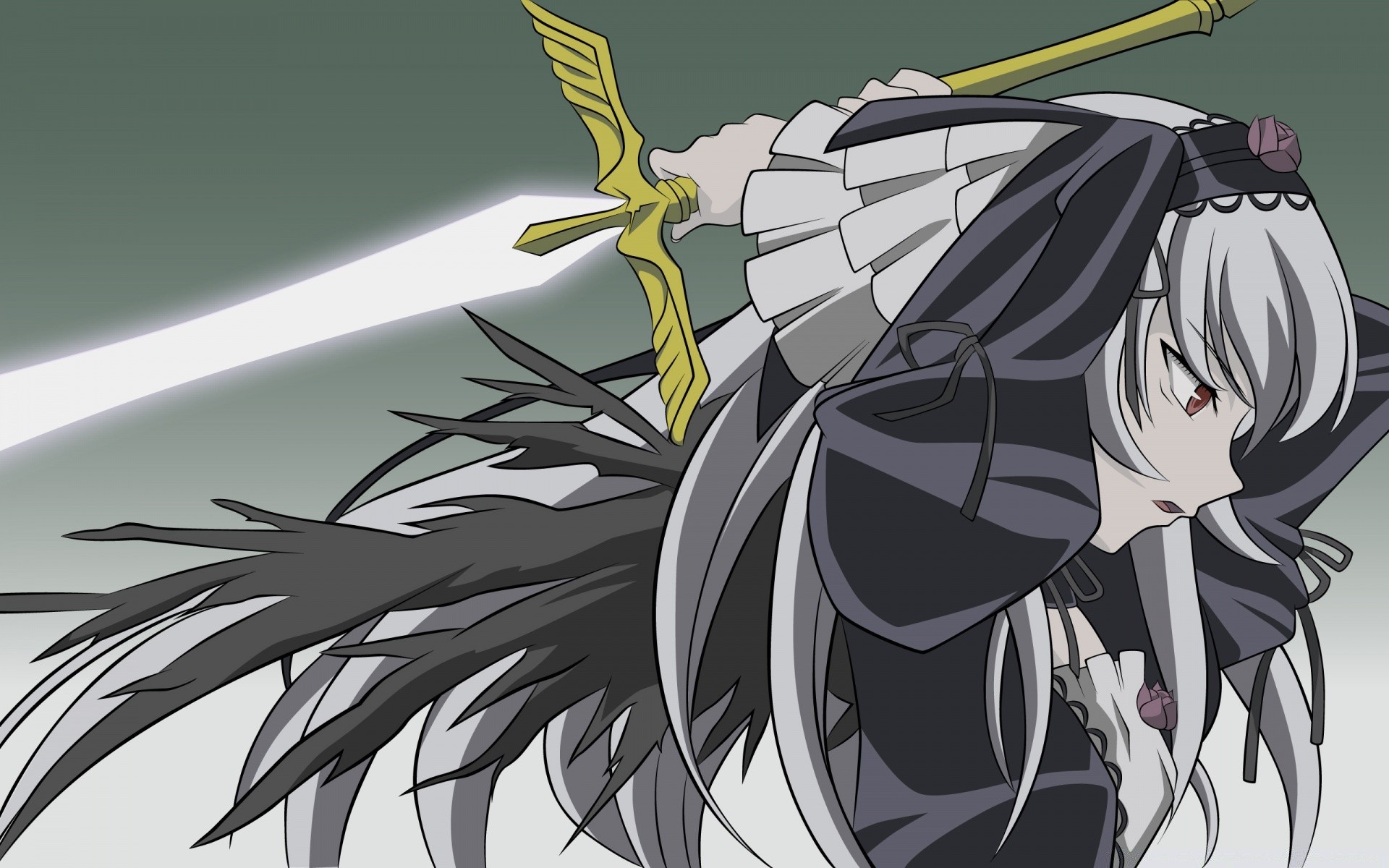 Heroína de anime, una chica en un vestido negro y gris con una espadaHeroína de anime, una chica en un vestido negro y gris con una espada