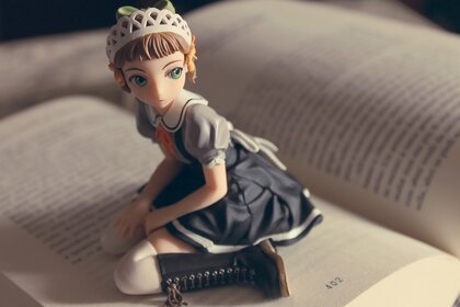 Chica en vestido libro texto botas hasta la rodilla