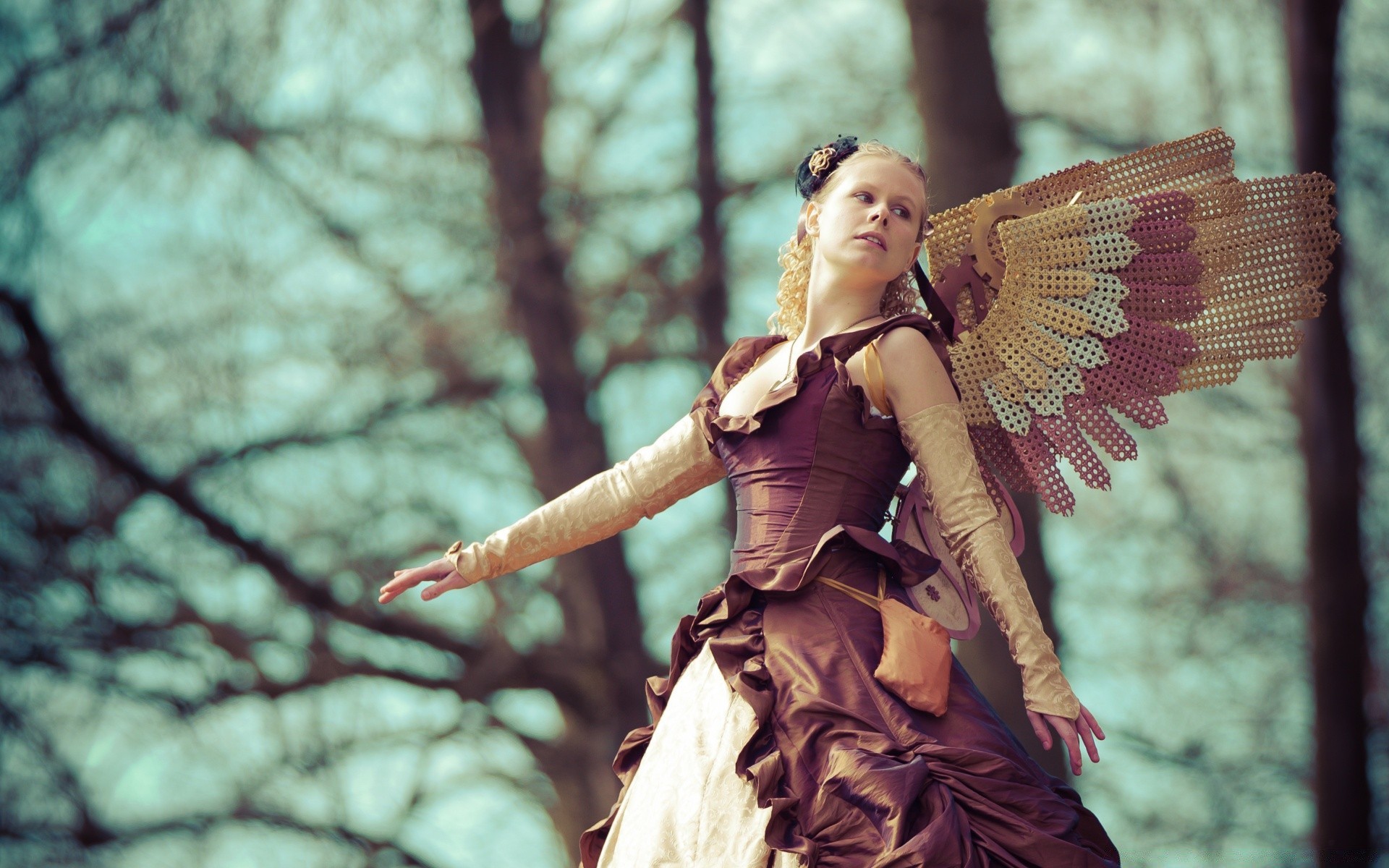 Hermosa chica con alas en el cielo