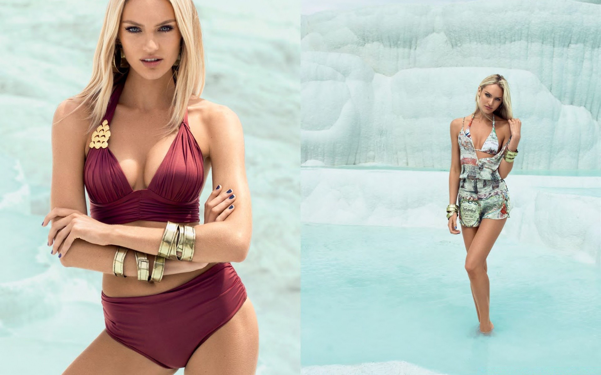 Modelos de chicas en trajes de baño en el fondo del agua