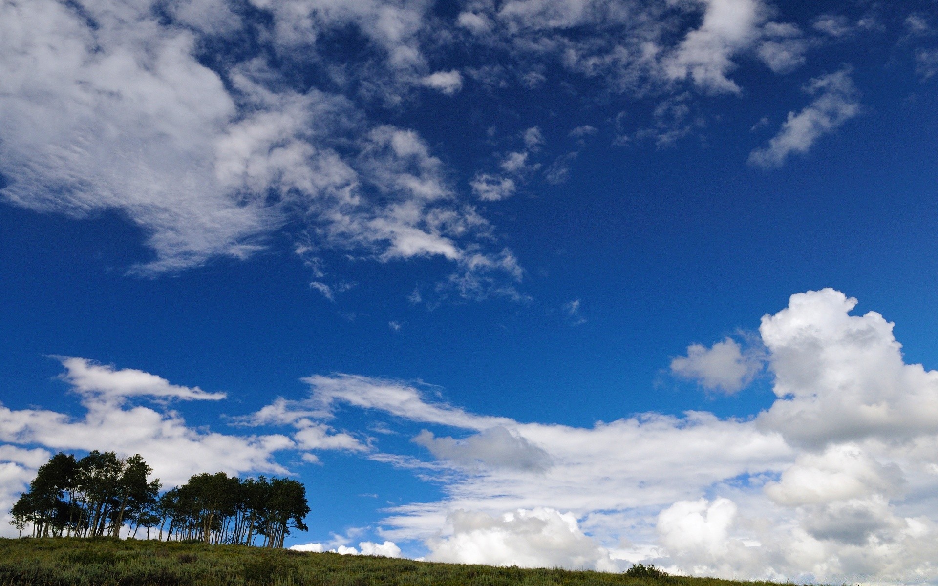 Hojas de plantas verdes contra un cielo azul y amarillo al atardecer
