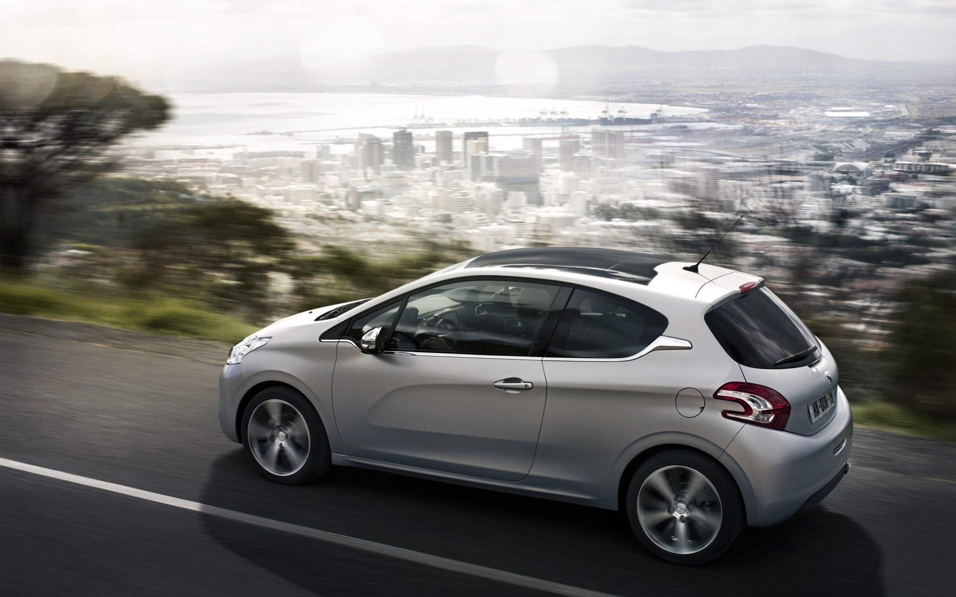 El coche de Peugeot en el fondo de la ciudad y el mar