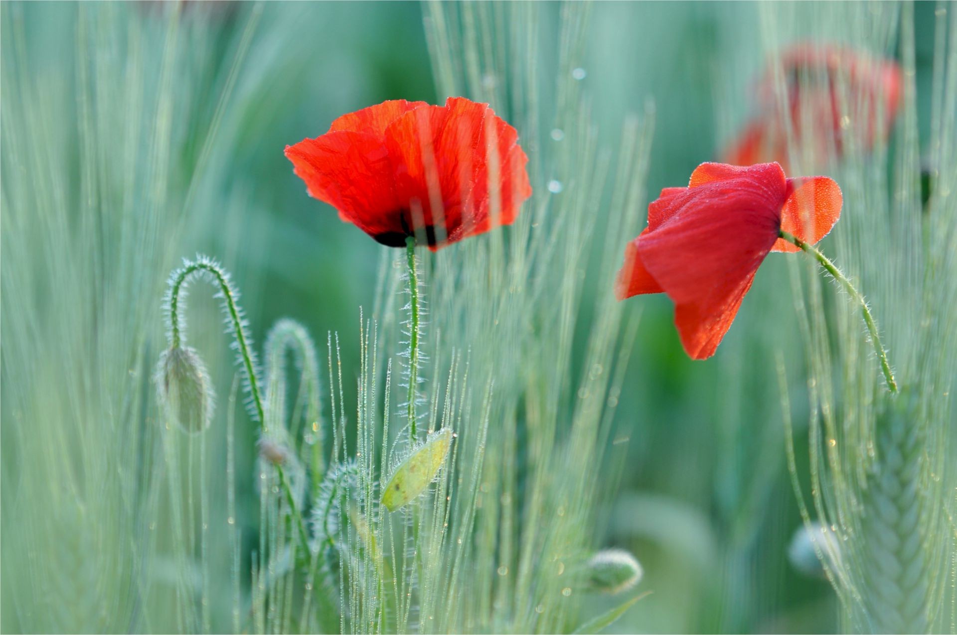 Amapolas rojas en hierba verde